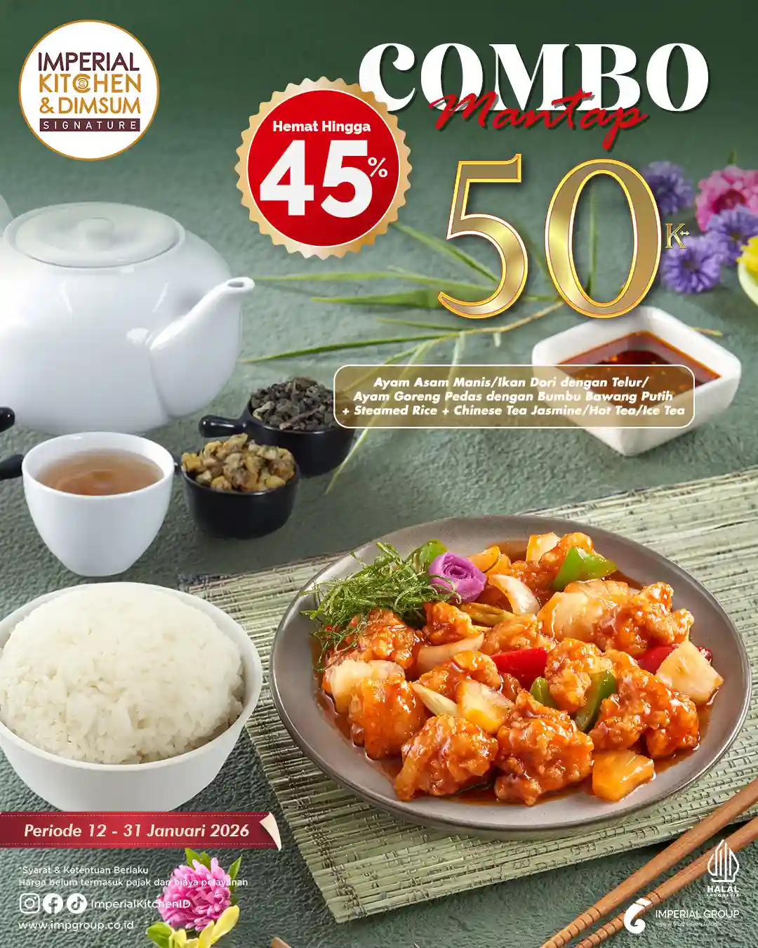 Imperial Kitchen & Dimsum menghadirkan promo Combo Mantap dengan harga Rp 50.000++ yang ditujukan bagi pelanggan yang ingin menikmati menu lengkap dengan harga lebih terjangkau. Promo ini berlaku hingga 31 Januari 2026 dan dapat dinikmati setiap hari di seluruh outlet Imperial Kitchen & Dimsum serta Imperial Kitchen & Dimsum Signature.