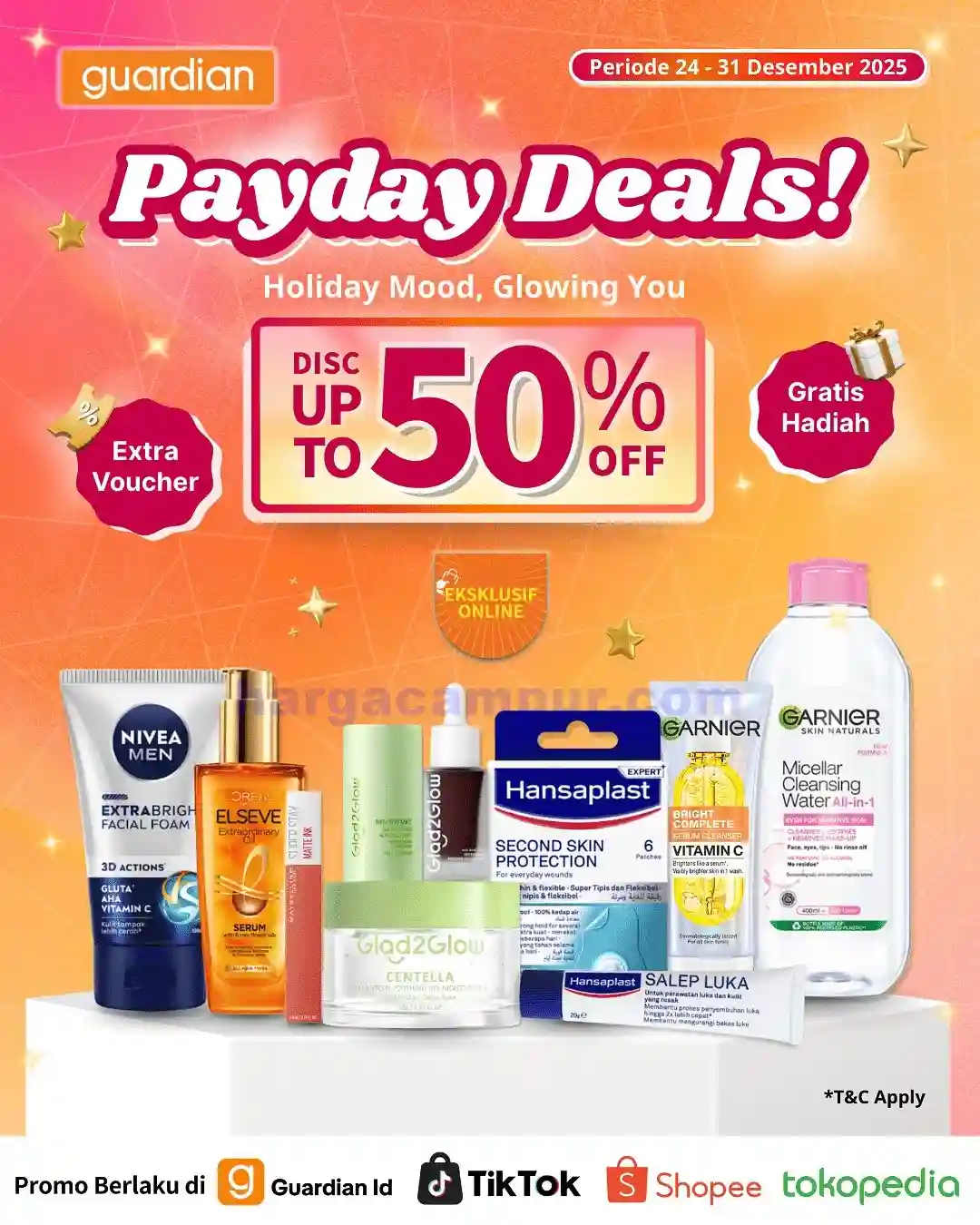 Promo Payday Deals kali ini menghadirkan diskon menarik untuk berbagai produk best seller Guardian, seperti masker wajah, vitamin, dan skincare populer. Cocok buat kamu yang ingin tampil fresh tanpa bikin dompet tipis.