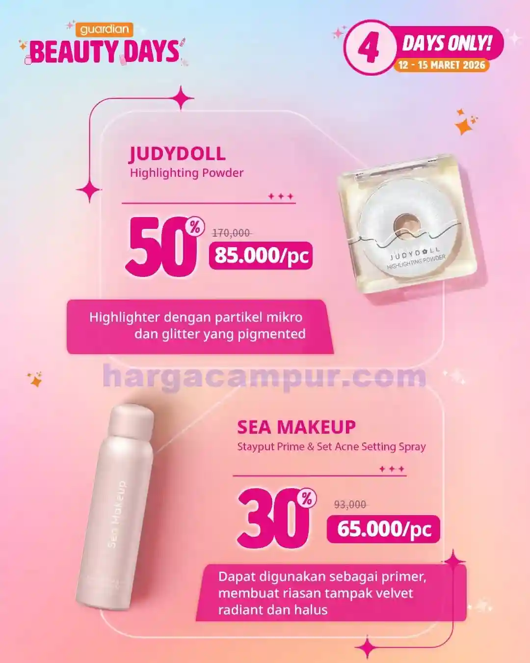 Promo Beauty Days kali ini menghadirkan diskon menarik untuk berbagai produk best seller Guardian, seperti masker wajah, vitamin, dan skincare populer. Cocok buat kamu yang ingin tampil fresh tanpa bikin dompet tipis.