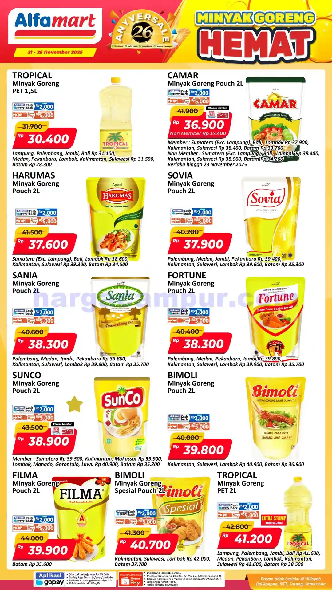 - Alfamart Minyak Goreng 2L — Rp 37.500 (Cashback Rp 2.000 via GoPay)