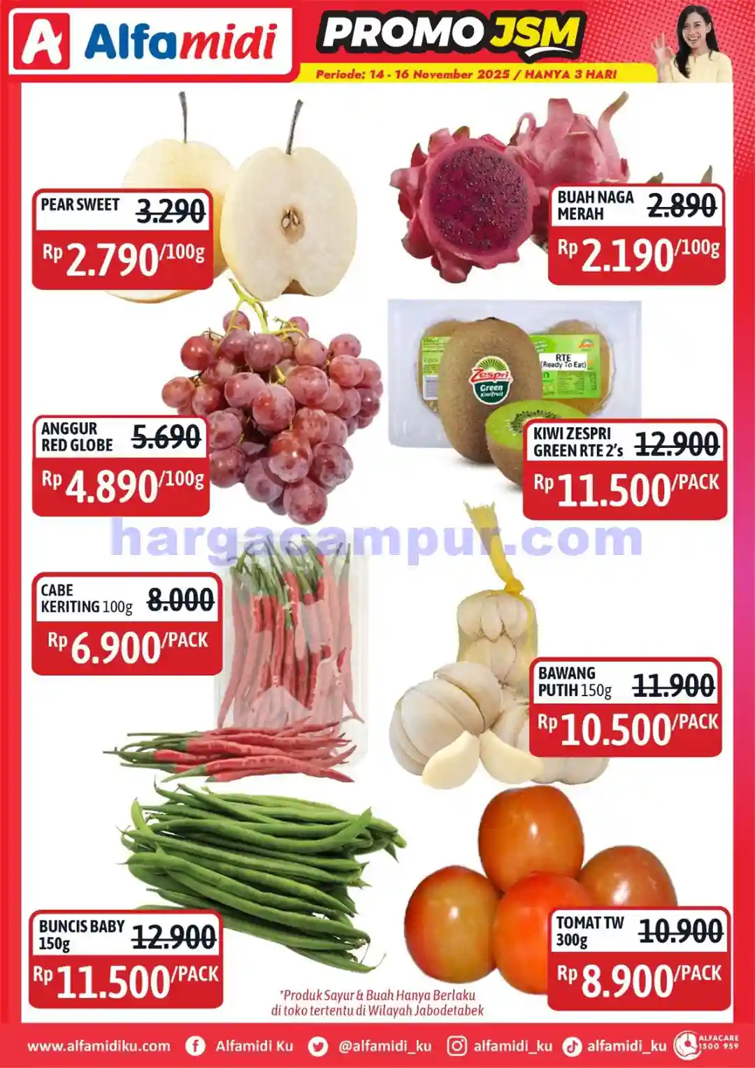 - Produk segar: seperti sayur dan buah juga mulai masuk dalam katalog promo mingguan. Walaupun stoknya terbatas di beberapa cabang, produk segar Alfamidi dikenal berkualitas dan sangat layak untuk dibeli.
