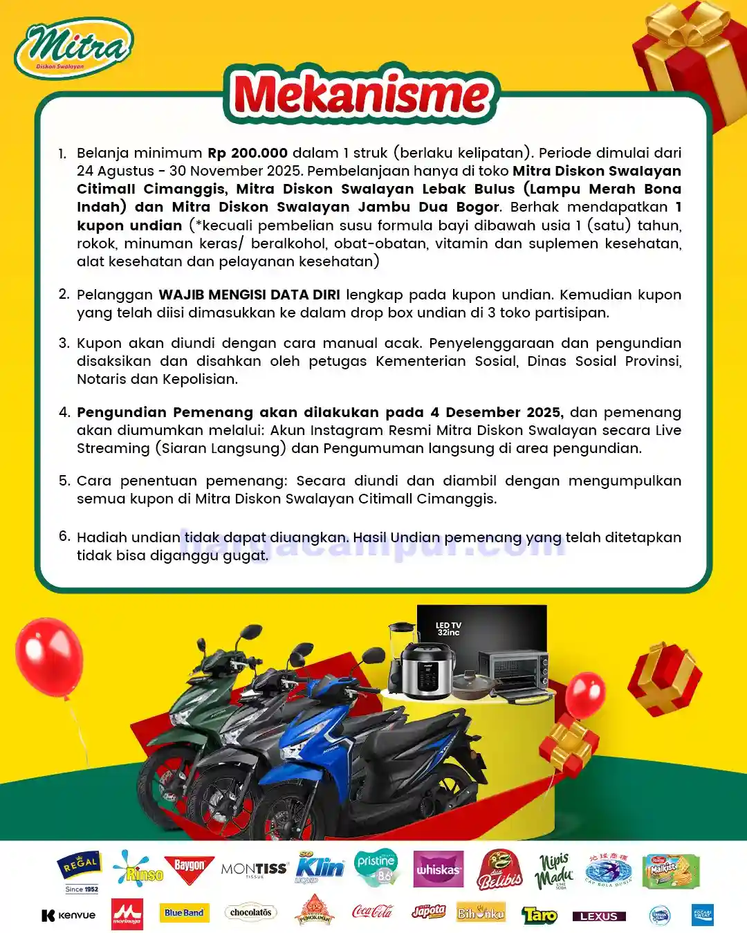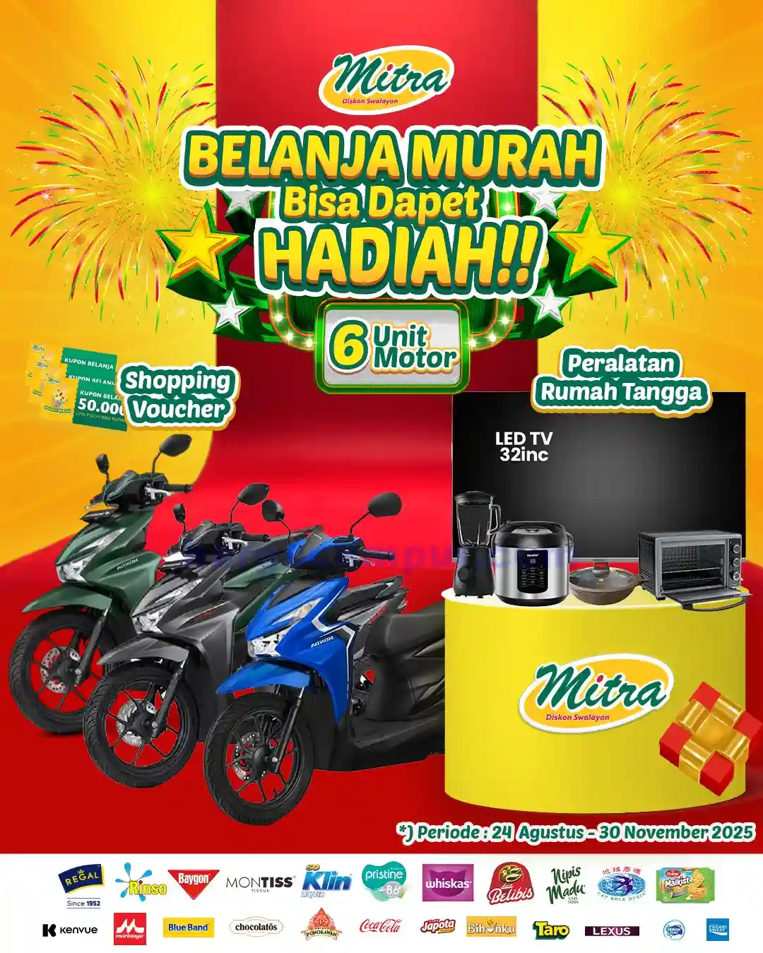 Mitra Diskon Swalayan kembali meluncurkan katalog promo mingguan dengan berbagai diskon menarik untuk kebutuhan rumah tangga, makanan, minuman, hingga perlengkapan anak dan produk kesehatan. Katalog ini berlaku untuk periode 28 hingga 30 November 2025, dan bisa ditemukan langsung di gerai maupun di akun media sosial resmi mereka.
