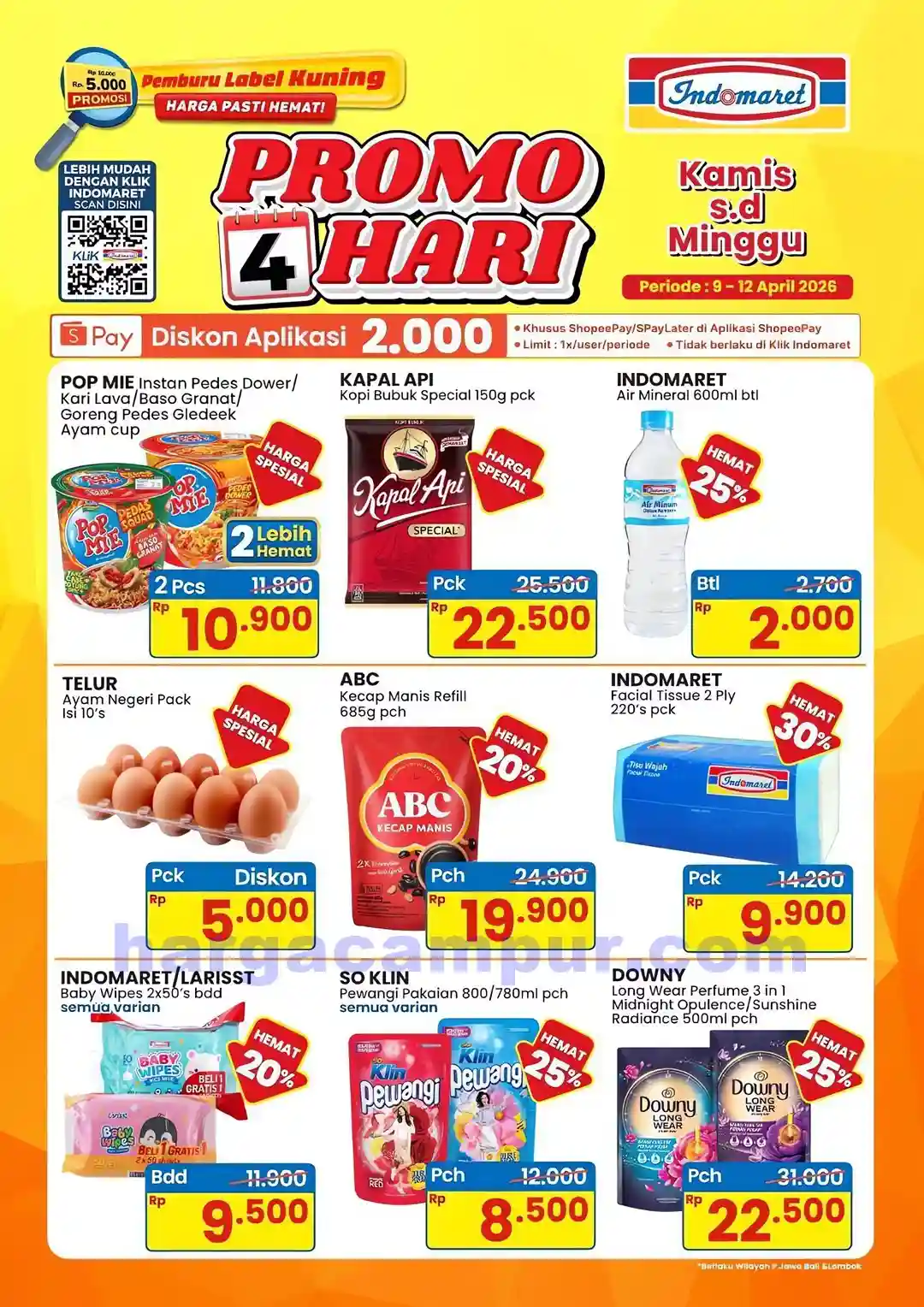 Indomaret kembali menghadirkan promo belanja hemat untuk periode 9 – 15 April 2026. Berbagai produk kebutuhan sehari-hari, mulai dari minyak goreng, mie instan, minuman, snack, hingga produk kebersihan dan perawatan diri, hadir dengan diskon hingga 40%.