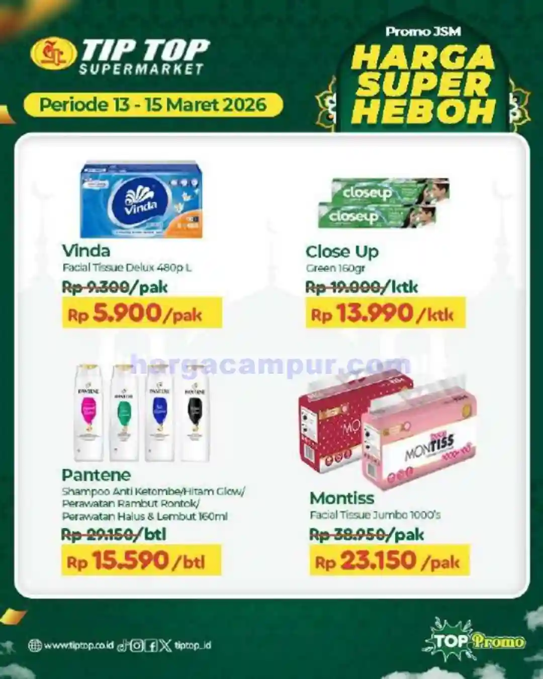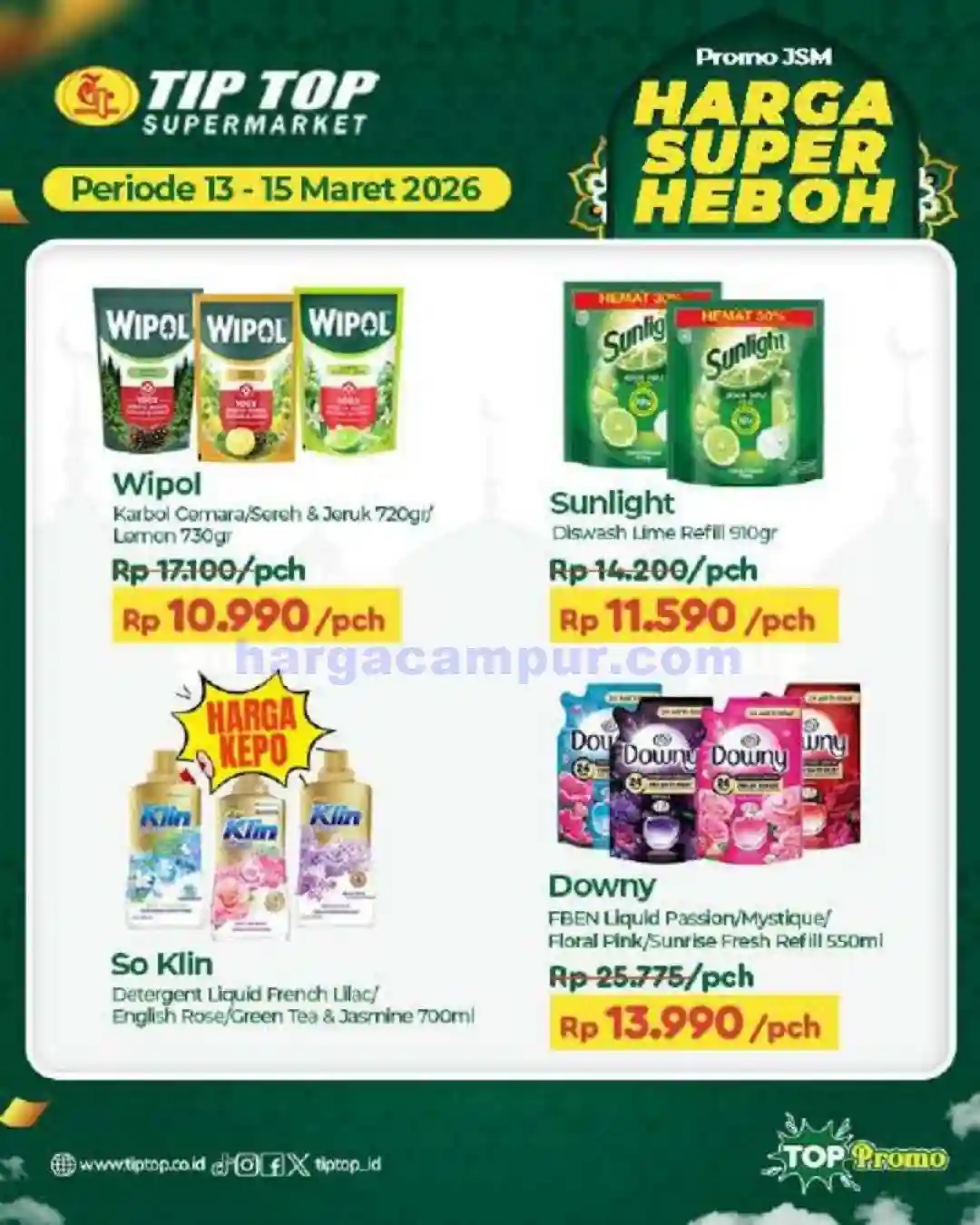 Berikut ini adalah katalog promo JSM TipTop Swalayan periode 13 – 15 Maret 2026 yang bisa kamu jadikan panduan sebelum belanja. Katalog ini berisi daftar lengkap produk-produk yang sedang diskon, mulai dari kebutuhan dapur, makanan ringan, perlengkapan mandi, hingga produk kebersihan rumah tangga.