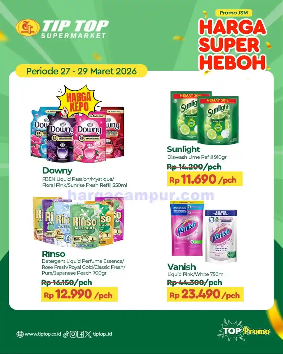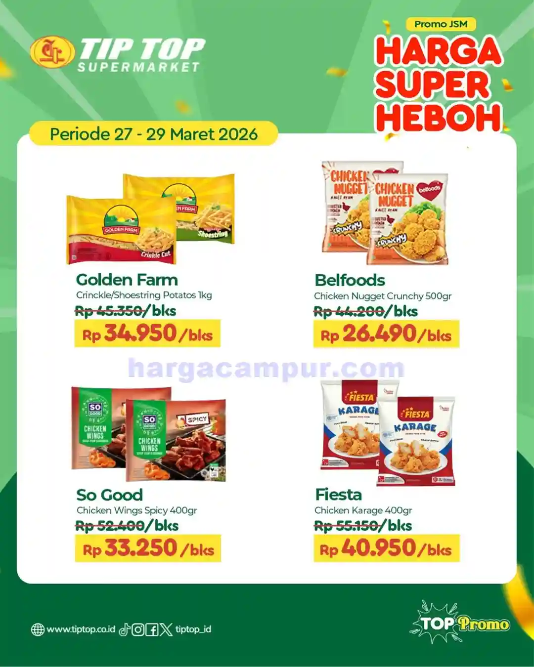 Berikut ini adalah katalog promo JSM TipTop Swalayan periode 27 – 29 Maret 2026 yang bisa kamu jadikan panduan sebelum belanja. Katalog ini berisi daftar lengkap produk-produk yang sedang diskon, mulai dari kebutuhan dapur, makanan ringan, perlengkapan mandi, hingga produk kebersihan rumah tangga.