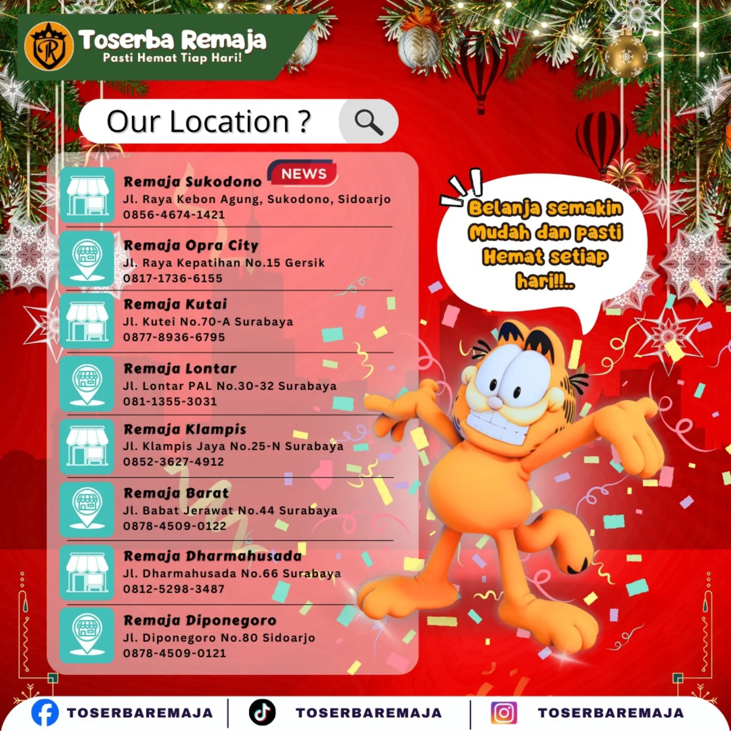 Toserba Remaja sudah hadir di banyak wilayah Indonesia, dari kota besar sampai daerah pinggiran. Pelayanan yang cepat dan produk yang tertata rapi membuat belanja jadi nyaman.