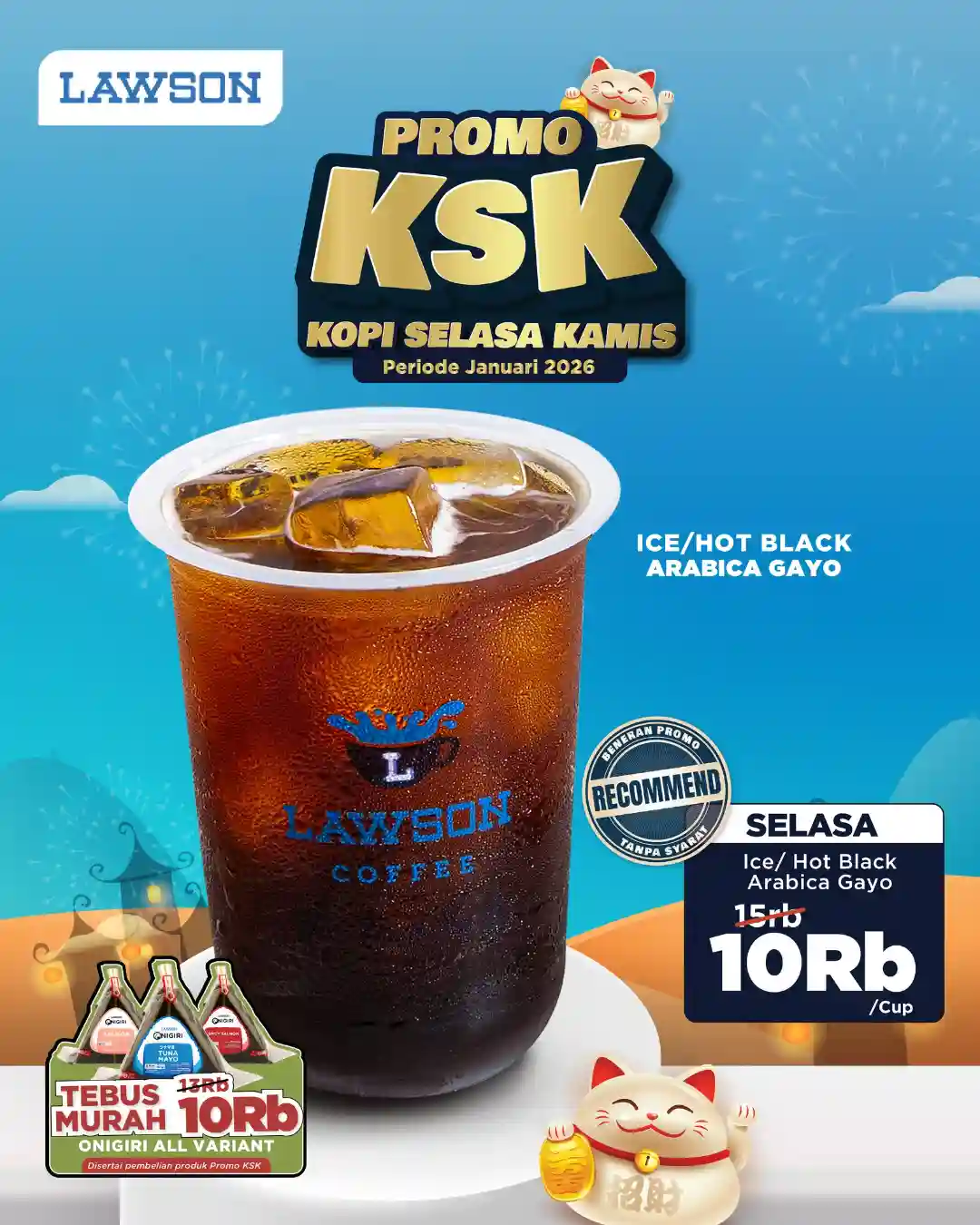 Lawson kembali menghadirkan program promo minuman melalui Promo KSK Kopi dengan harga Rp10.000 yang berlaku setiap hari Selasa dan Kamis sepanjang Januari 2026. Program ini ditujukan bagi pelanggan yang ingin menikmati kopi Arabica Gayo dengan harga lebih terjangkau di tengah aktivitas harian.