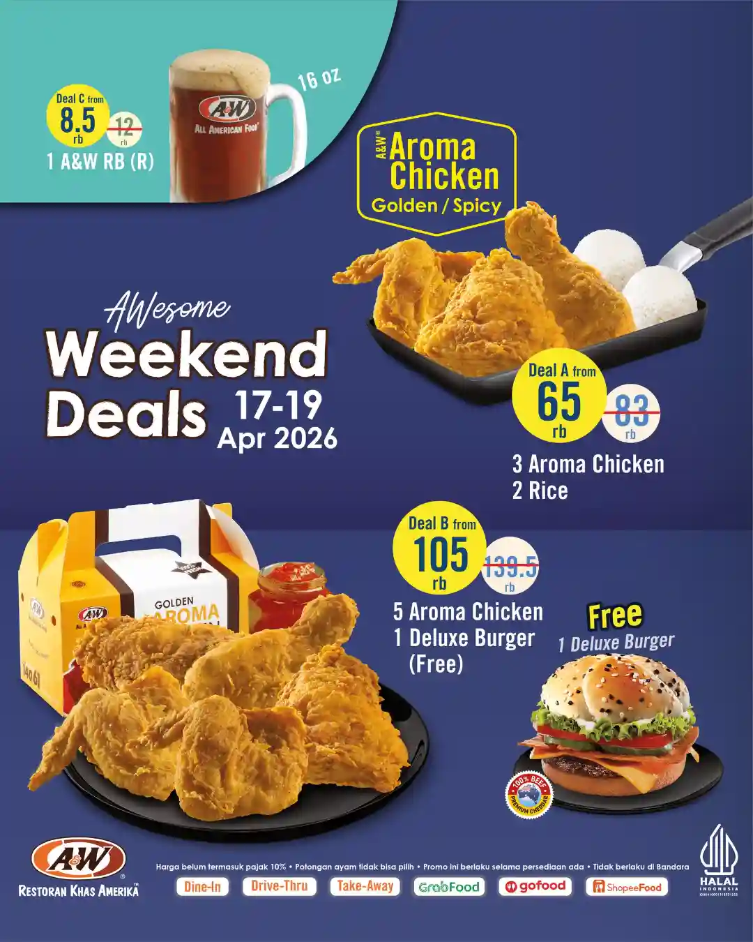 Promo AWesome Weekend Deals 17 – 19 April 2026 adalah kesempatan terbaik untuk menikmati hidangan favorit A&W dengan harga lebih terjangkau. Dengan tiga pilihan paket hemat mulai dari Deal A untuk porsi kecil, Deal B untuk keluarga, hingga Deal C untuk sekadar menikmati segarnya Root Beer semua orang bisa menemukan pilihan yang sesuai dengan kebutuhannya.