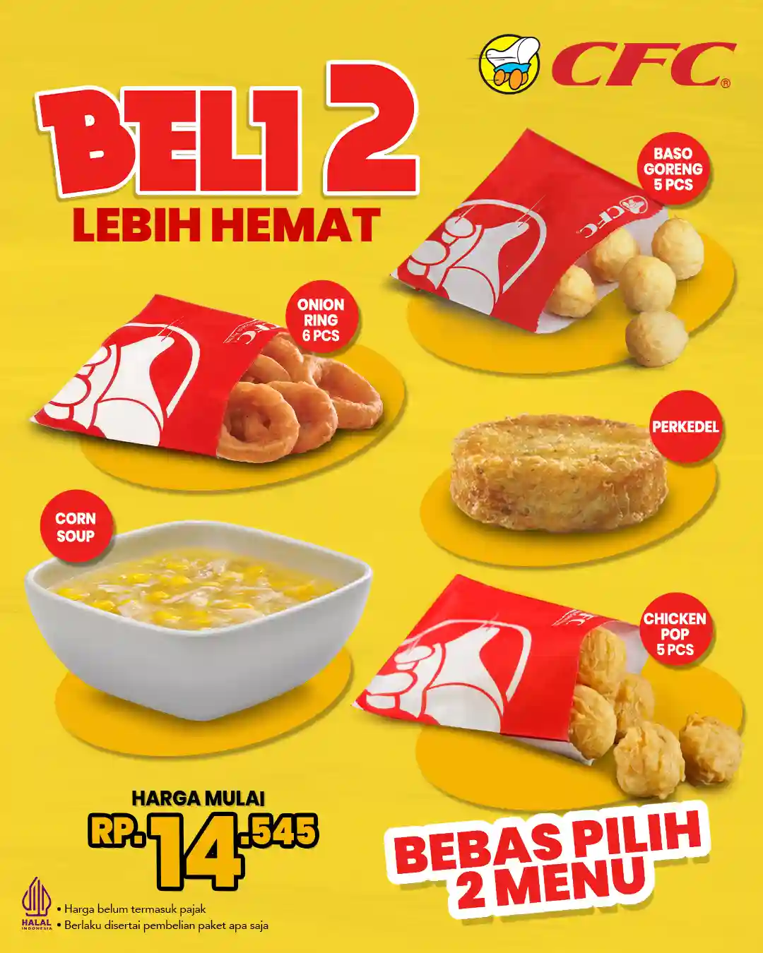 California Fried Chicken (CFC) menghadirkan program “Beli 2 Lebih Hemat” yang memungkinkan pelanggan menambahkan dua menu tambahan dengan harga mulai Rp14.545 sebelum pajak. Promo ini berlaku selama periode program berlangsung di seluruh outlet CFC Indonesia.