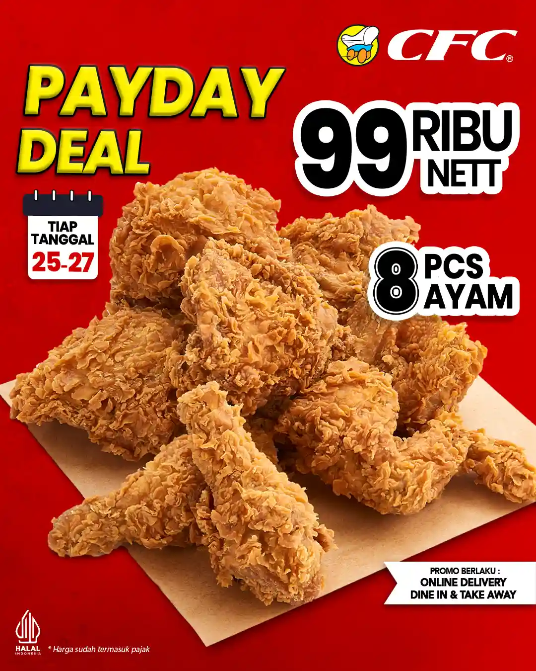Momen gajian jadi waktu yang pas buat makan rame-rame lebih hemat. CFC menghadirkan Promo Payday Deal berupa 8 potong ayam goreng hanya Rp 99.000 nett, penawaran yang cocok untuk dinikmati bersama keluarga maupun teman.