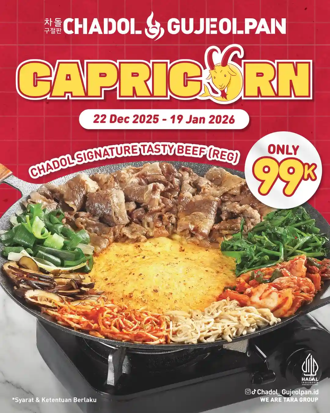 Promo zodiak kembali hadir dari Chadol Gujeolpan lewat program Promo Capricorn Chadol Signature Tasty Beef Rp 99.000. Promo ini ditujukan khusus untuk pelanggan yang berzodiak Capricorn dan ingin merayakan bulan ulang tahun dengan pengalaman makan daging premium yang lebih hemat.