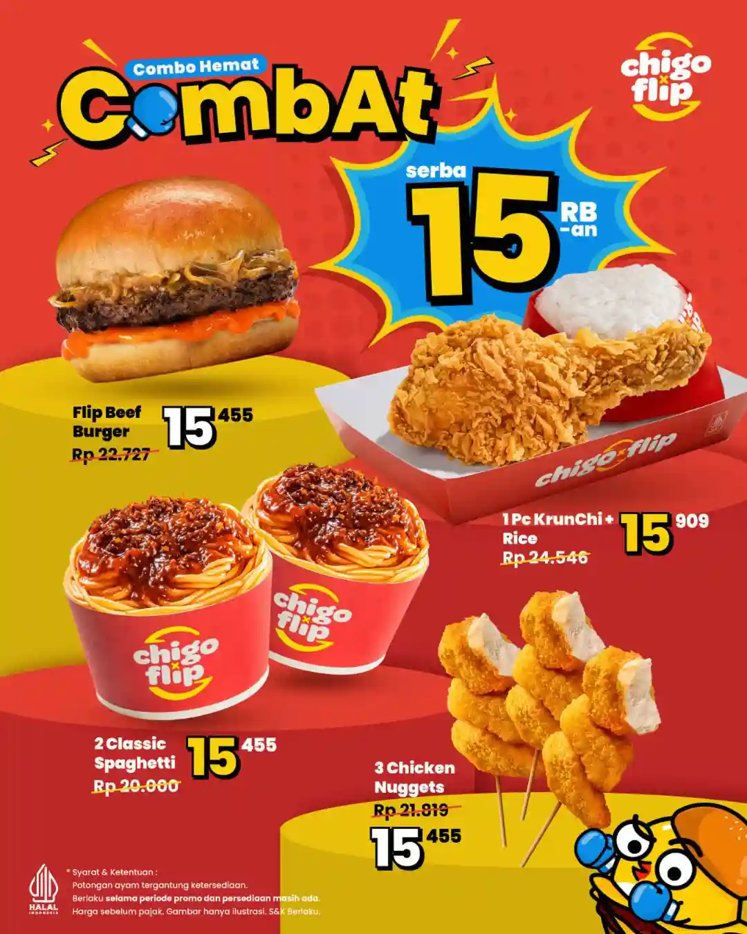 Dalam promo ini, pelanggan bebas memilih salah satu menu CombAt favorit yang tersedia. Pilihannya mencakup Flip Beef Burger, 1 potong KrunChi lengkap dengan nasi, 2 porsi Classic Spaghetti, atau 3 Chicken Nuggets. Dengan variasi tersebut, promo ini bisa disesuaikan baik untuk makan sendiri maupun berbagi ringan bersama teman.