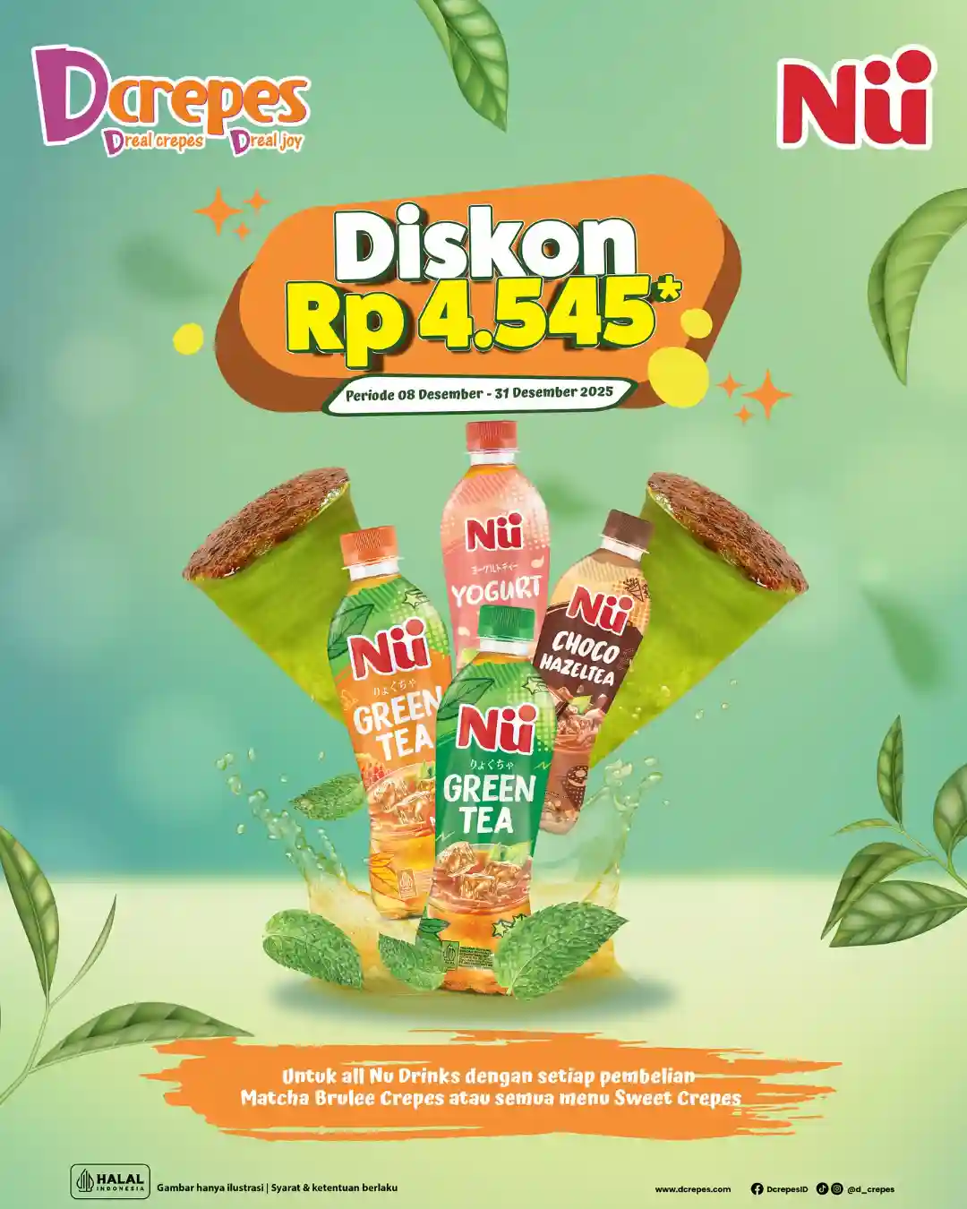 Akhir tahun memang selalu jadi waktu yang pas untuk menjelajahi promo kuliner, dan Dcrepes kembali menghadirkan penawaran menarik yang sayang untuk dilewatkan. Sebagai seseorang yang cukup sering mampir ke outlet Dcrepes—baik untuk camilan cepat maupun sekadar mengisi waktu istirahat promo kali ini terasa pas banget buat kamu yang suka menikmati crepes sambil ditemani minuman segar. Dengan judul “Promo Dcrepes Spesial All Nu Drinks Diskon Hingga 4 Ribuan”, penawaran ini memberi kesempatan bagi pelanggan untuk mendapatkan diskon minuman Nu Drinks setiap membeli varian crepes tertentu.