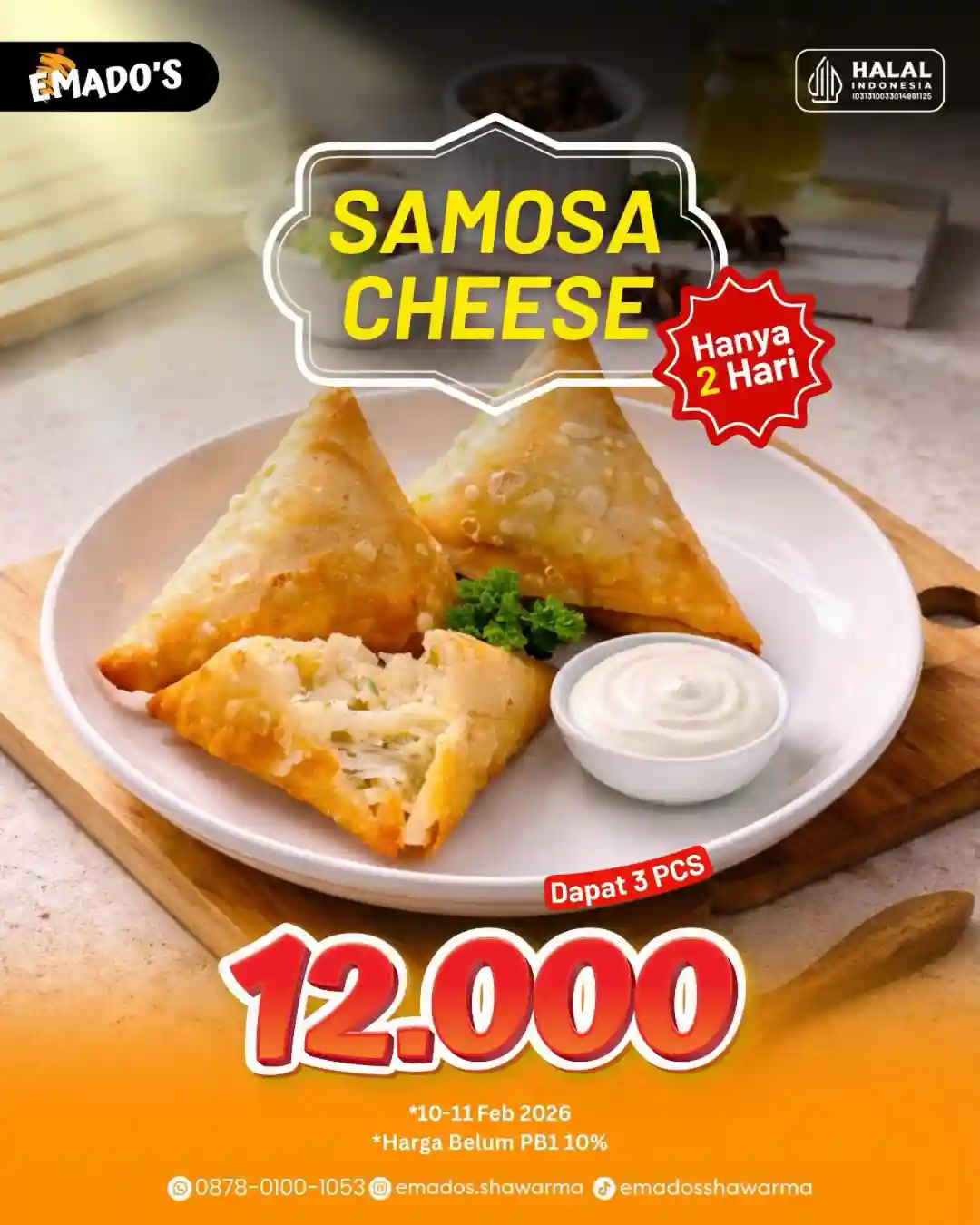 Promo Samosa Cheese ini berlaku sesuai ketentuan yang ditetapkan Emado’s selama periode program berlangsung.