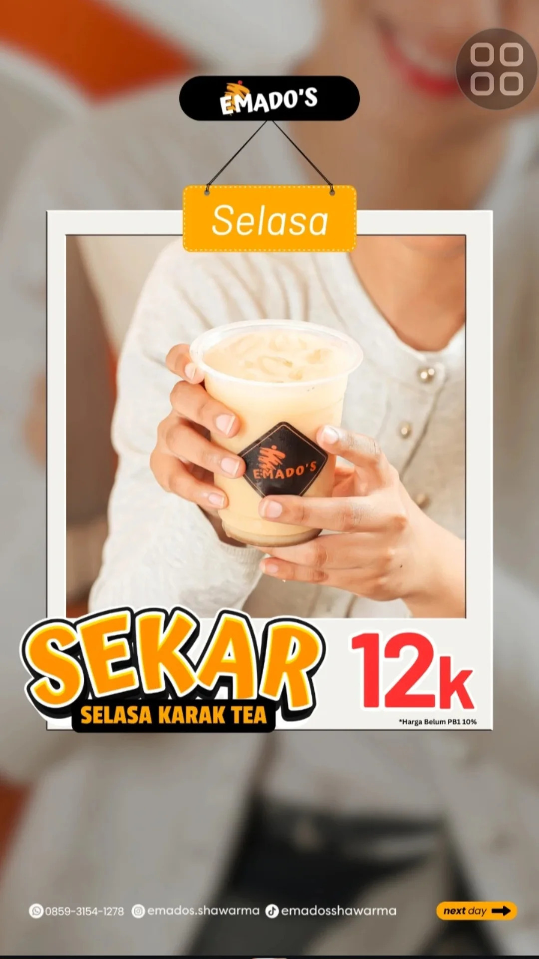 Emados Shawarma menghadirkan program minuman bertajuk Selasa Karak Tea dengan harga khusus Rp12.000. Promo ini berlaku untuk menu Karak Tea dan dapat dinikmati di seluruh gerai Emados selama persediaan masih tersedia.