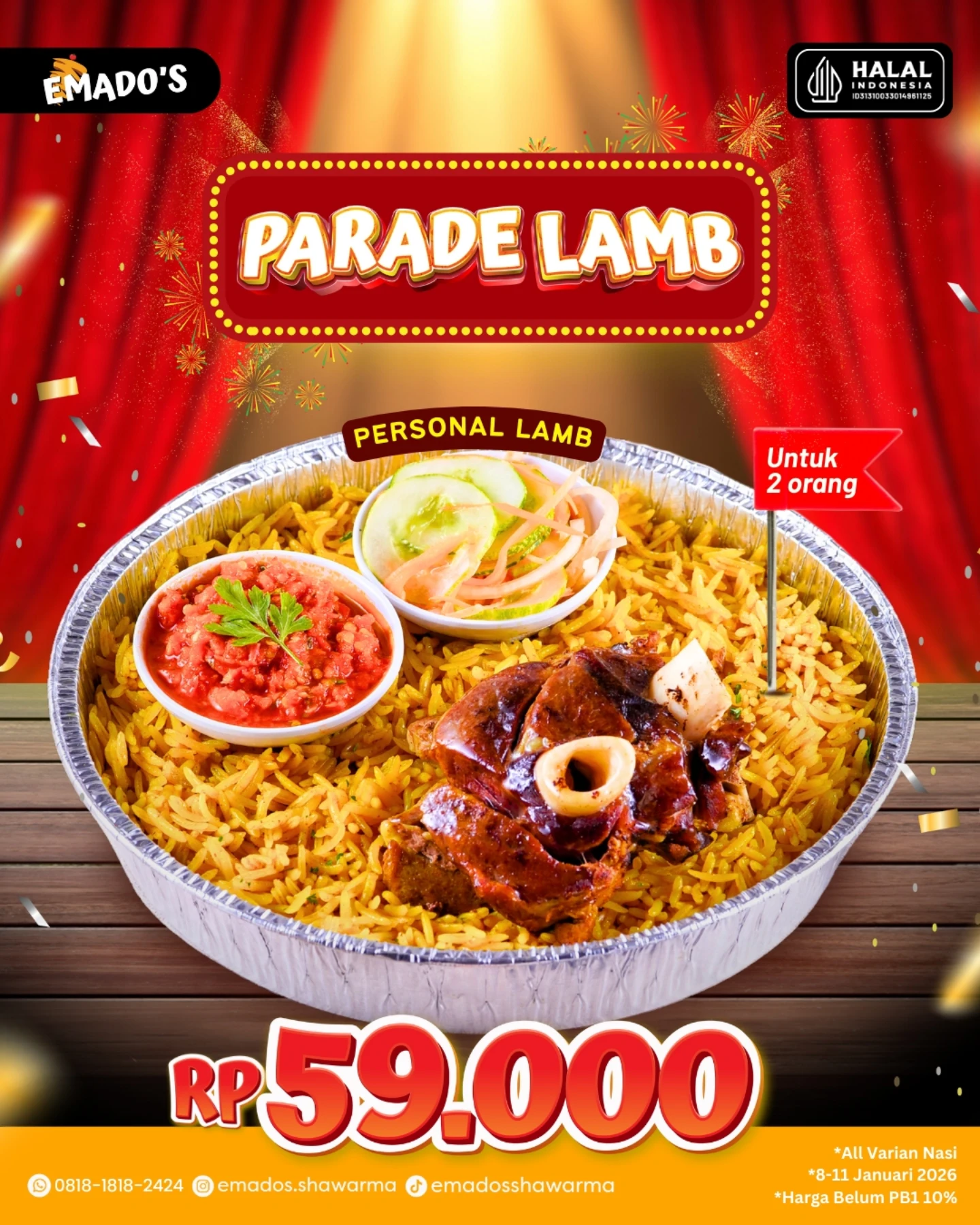 Jangan lewatkan kesempatan menikmati Promo Emados Spesial Parade Lamb Harga Hanya 59 Ribu yang berlaku 8–11 Januari 2026. Ajak teman atau keluarga, kunjungi Emados terdekat, dan manfaatkan momen langka ini untuk menikmati hidangan lamb berkualitas dengan harga yang lebih bersahabat.