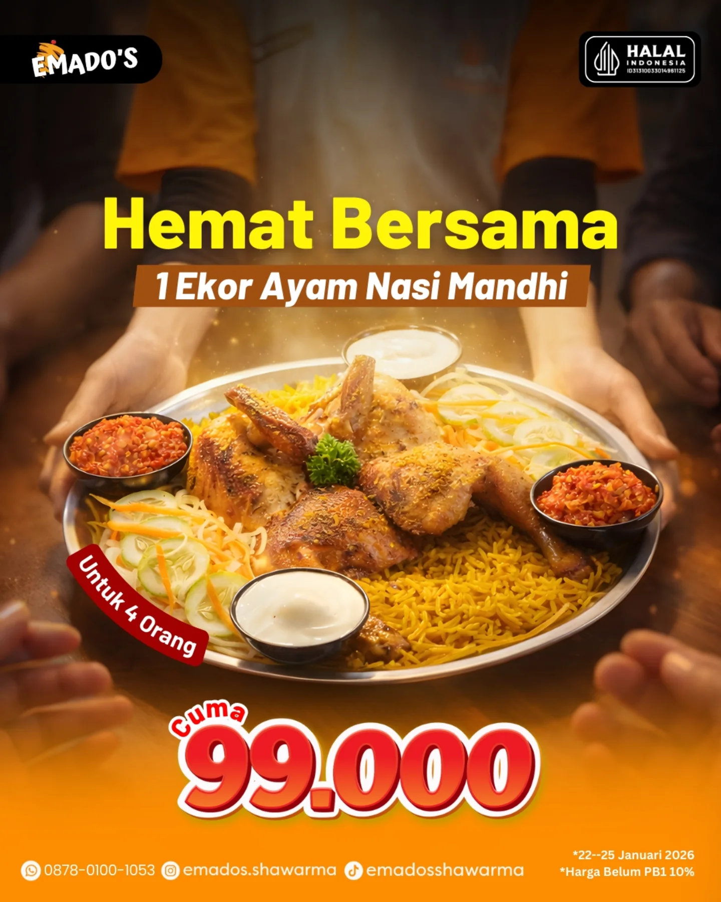 Emado’s menghadirkan promo hemat untuk dinikmati ramai-ramai lewat paket 1 ekor Ayam Nasi Mandhi seharga Rp 99.000. Paket ini dirancang untuk porsi berbagi hingga 4 orang, cocok untuk makan bareng keluarga, sahabat, atau satu circle tanpa bikin kantong jebol.