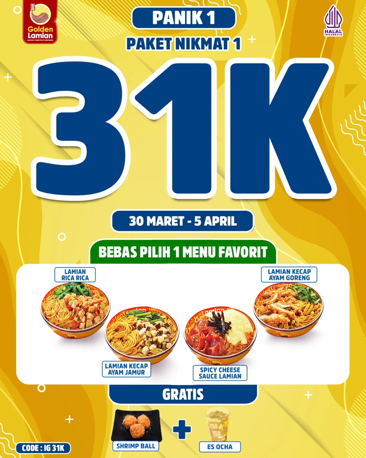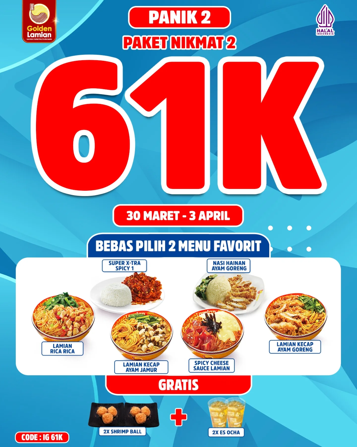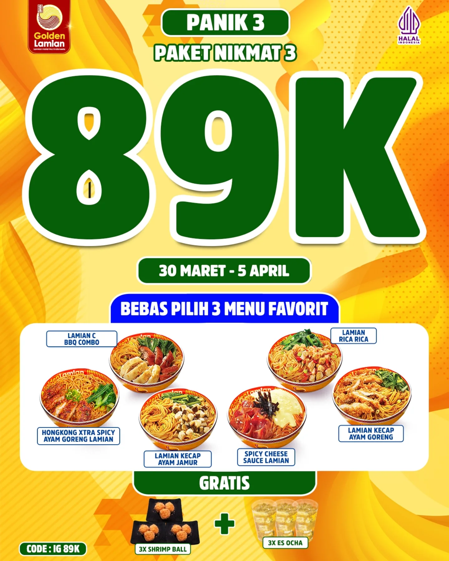 Golden Lamian kembali menghadirkan promo spesial yang akan membuat pecinta kuliner terpesona. Promo kali ini bertajuk Paket Nikmat, dengan harga mulai dari 30 ribu saja! Yuk, nikmati sajian lezat dan hemat dari Golden Lamian yang hanya berlaku pada tanggal 30 Maret – 5 April 2025 di semua store (kecuali Medan dan Bintaro Jaya Xchange). Jangan sampai kelewatan, karena promo ini akan mengisi perut kamu dengan menu nikmat tanpa membuat kantong bolong!