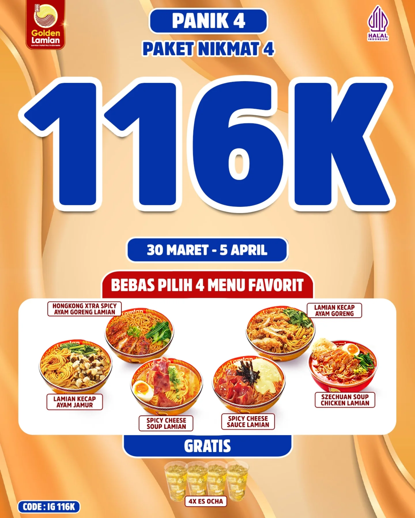 Siap-siap untuk makan enak dan hemat dengan Paket Nikmat 1 dari Golden Lamian yang ditawarkan hanya dengan 30 ribu rupiah! Dengan harga tersebut, kamu sudah bisa menikmati: