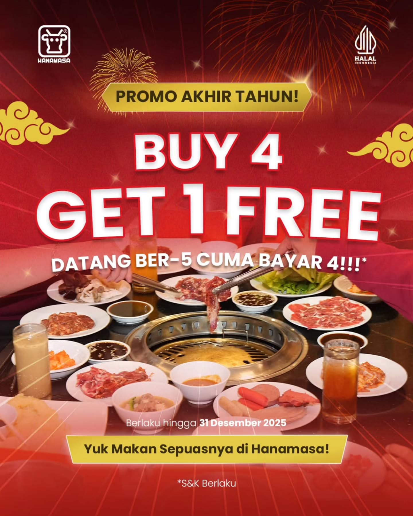 Akhir tahun selalu identik dengan momen kumpul, makan bersama, dan merayakan pencapaian setahun penuh. Di momen seperti inilah Hanamasa kembali menghadirkan promo yang paling ditunggu para pecinta yakiniku dan shabu-shabu. Lewat program Promo Hanamasa Harga Spesial Akhir Tahun Beli 4 Gratis 1, makan rame-rame jadi jauh lebih hemat dan terasa lebih seru. Cukup datang berlima, satu orang bisa makan gratis tanpa kompromi soal menu maupun kualitas.