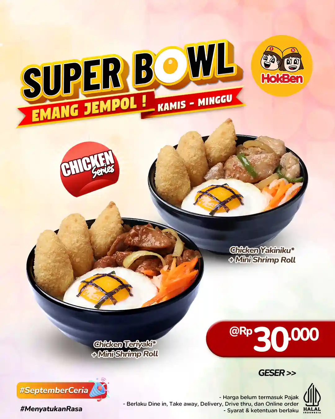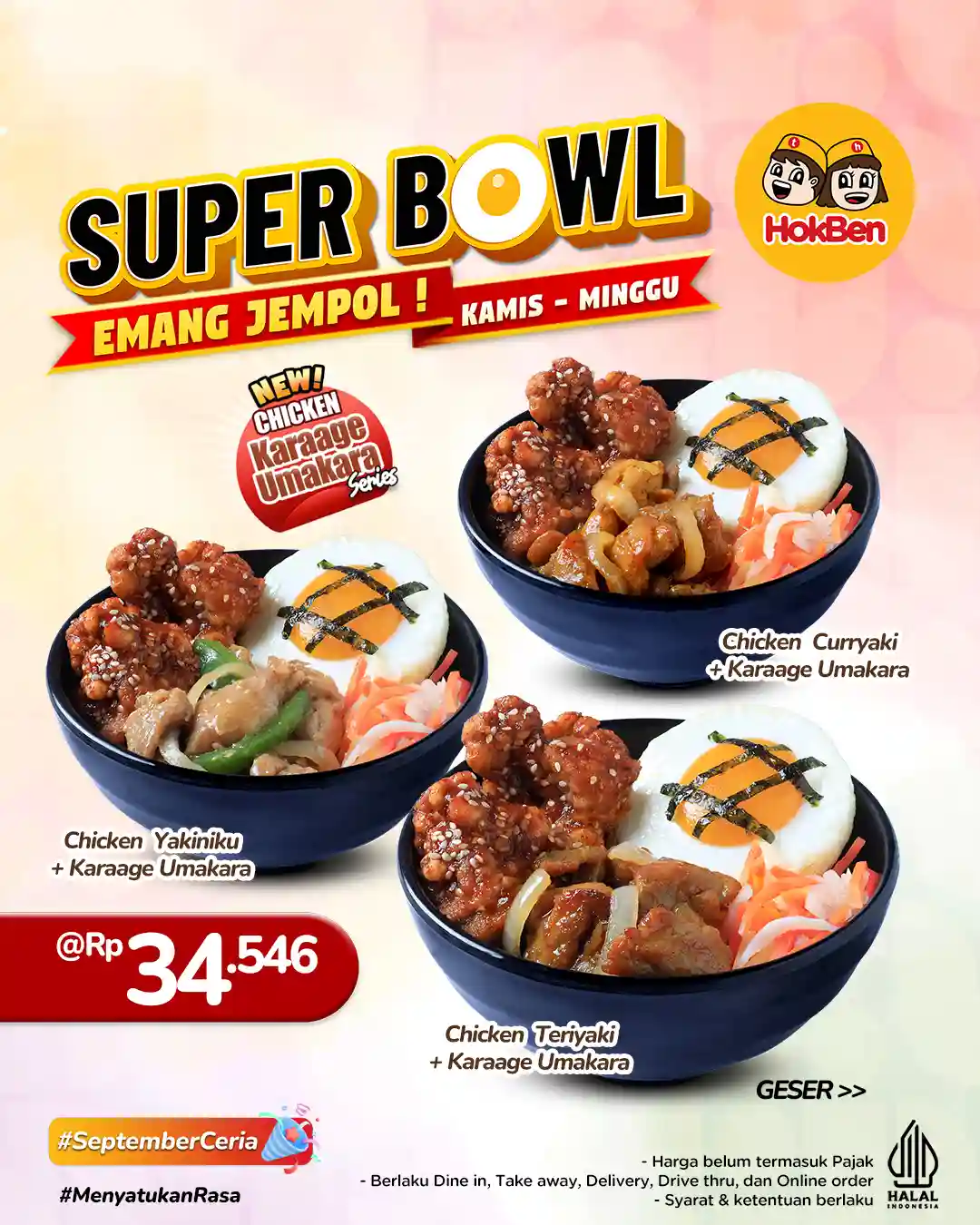 Hokben kembali menghadirkan promo spesial yang sayang untuk dilewatkan, khususnya bagi pencinta makanan Jepang praktis dan lezat. Mulai dari Kamis hingga Minggu, Anda bisa menikmati menu lengkap dalam kemasan Super Bowl Hokben dengan harga mulai dari 30 ribuan saja. Promo ini menjadi kabar baik bagi pelanggan setia maupun mereka yang baru ingin mencoba sajian khas Hokben.
