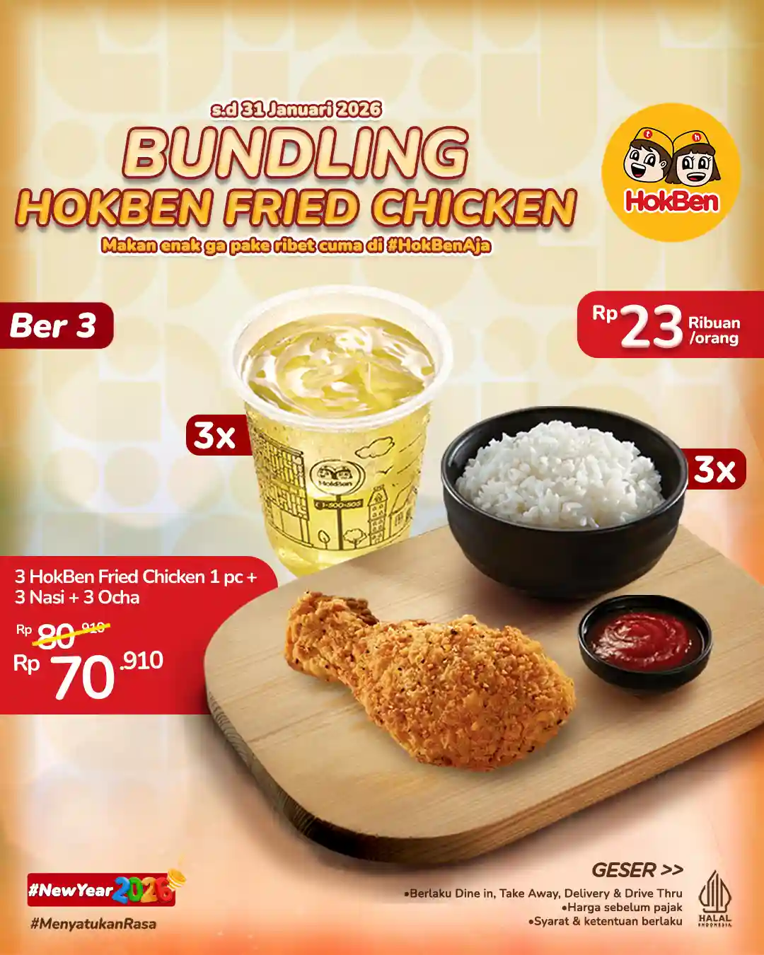 Jangan lewatkan kesempatan hingga 31 Januari 2026 ini. Ajak orang terdekat, pilih paket yang paling sesuai, dan nikmati sensasi HokBen Fried Chicken yang krispi di luar dan lezat di dalam sebagai momen makan bersama yang lebih hemat dan berkesan.