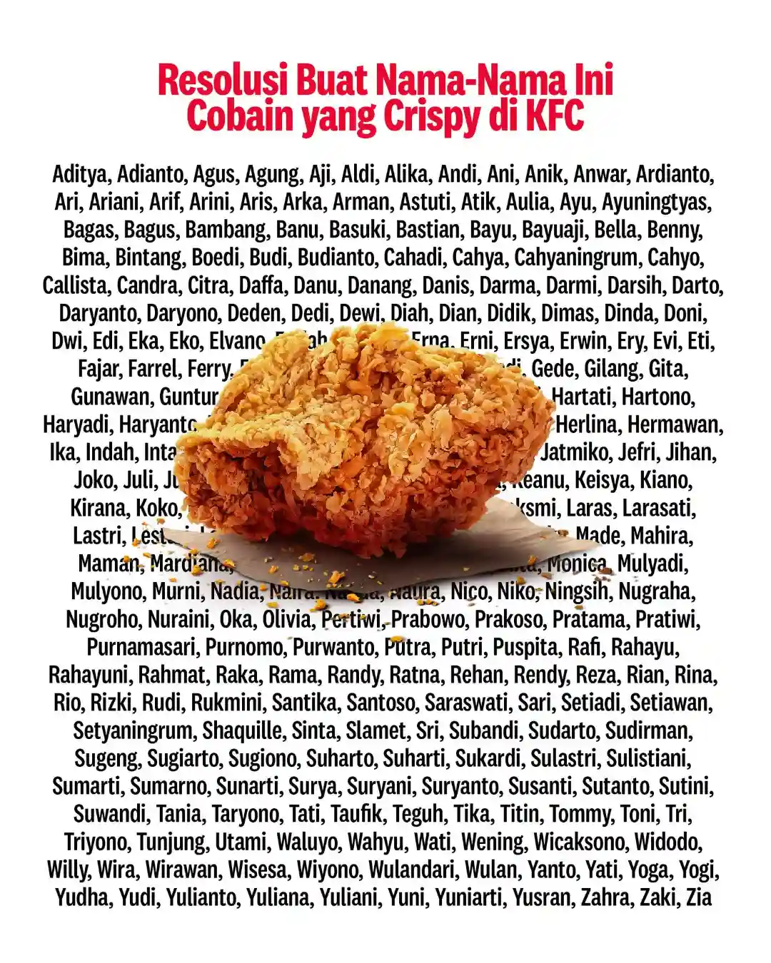 Program ini juga dikaitkan dengan daftar nama tertentu sesuai materi promo. Untuk memastikan nama yang termasuk, pelanggan disarankan melihat visual/flyer resmi promo dari KFC.