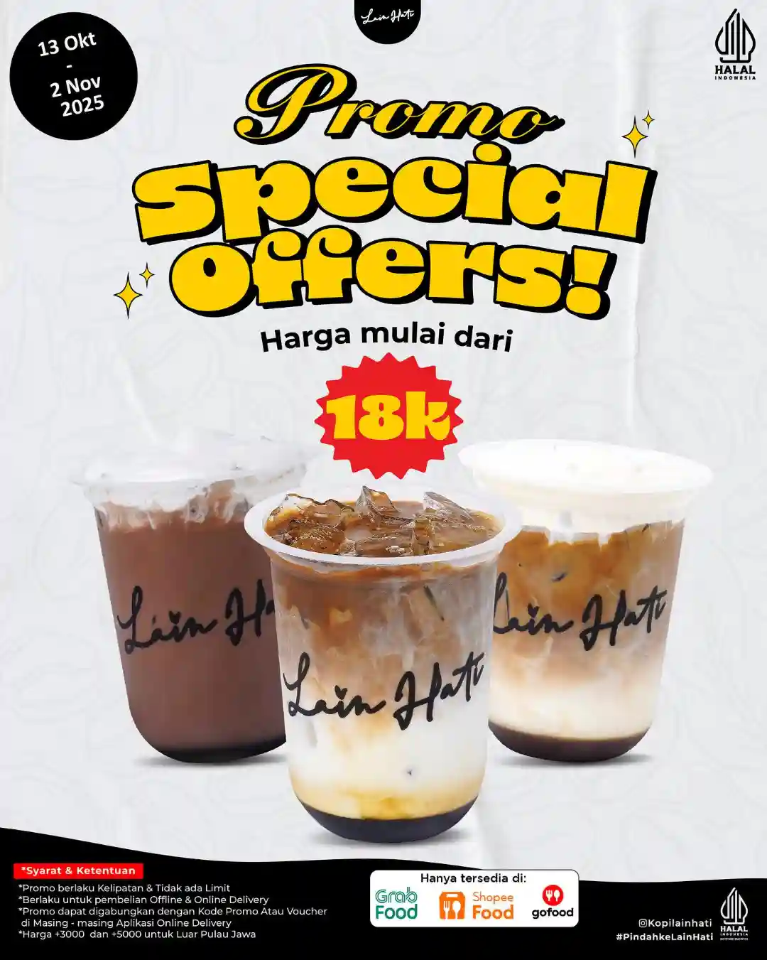Buat para pencinta kopi lokal, inilah kabar yang pasti bikin hati berbunga. Kopi Lain Hati kembali menghadirkan promo istimewa bertajuk Special Offer dengan harga minuman mulai Rp18.000 saja. Promo ini berlaku di seluruh outlet Kopi Lain Hati dan juga bisa kamu nikmati melalui layanan pesan antar favorit seperti GrabFood, GoFood, dan ShopeeFood.