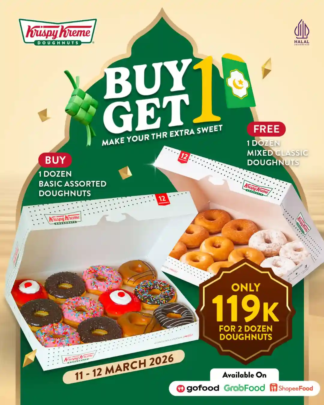 Jaringan gerai donat Krispy Kreme menghadirkan promo beli satu gratis satu lusin donat pada 11–12 Maret 2026 di seluruh gerai yang berpartisipasi di Indonesia.