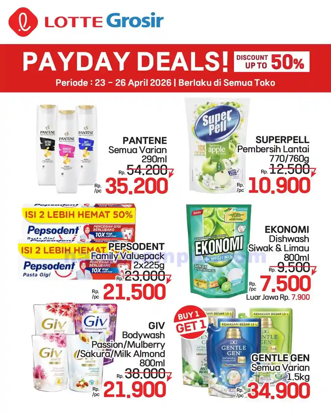 - Diskon besar untuk produk rumah tangga, seperti deterjen, sabun cuci piring, dan pewangi pakaian.