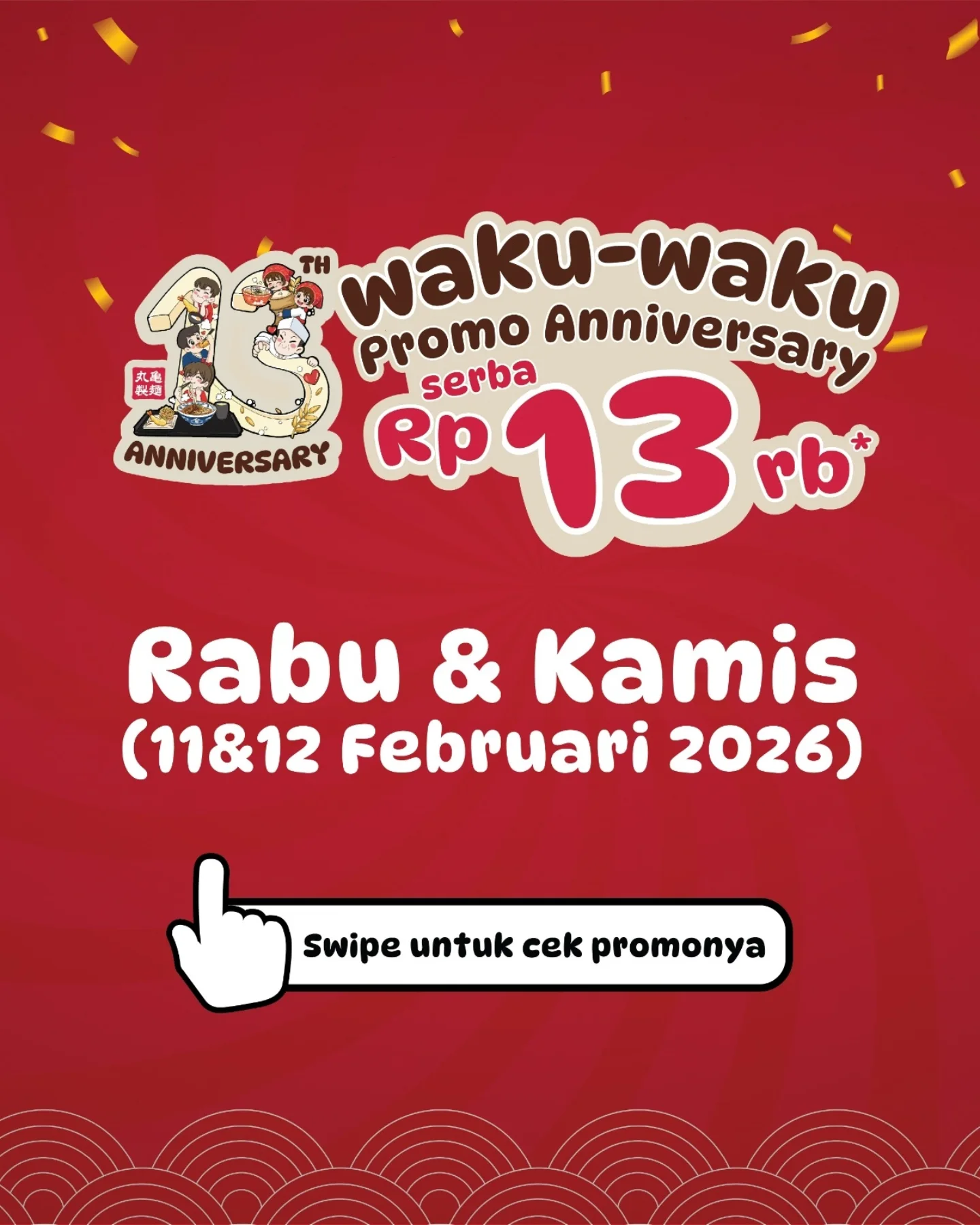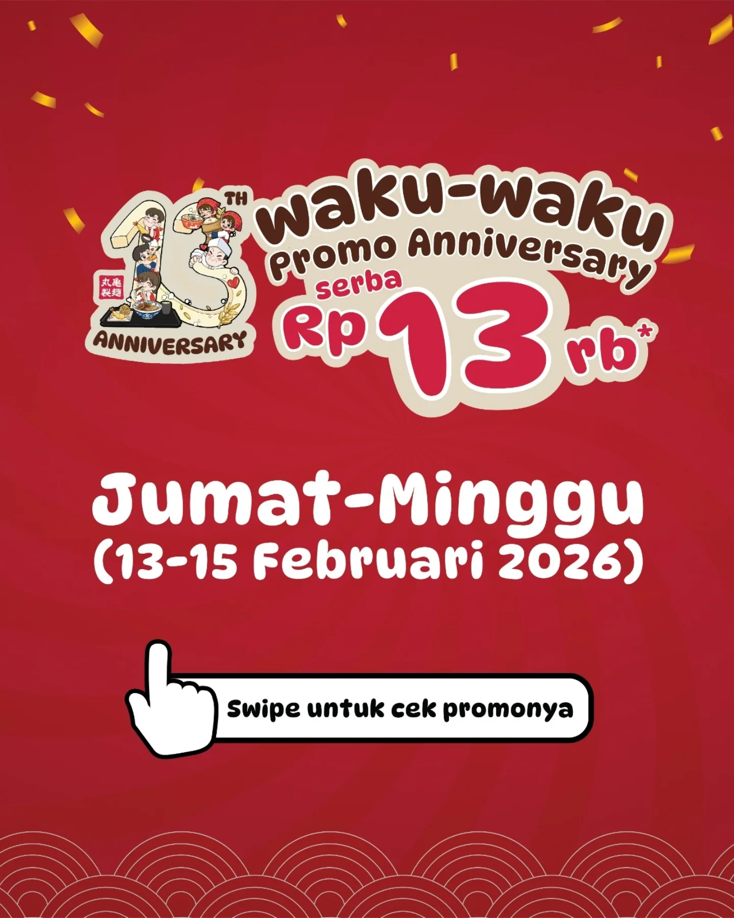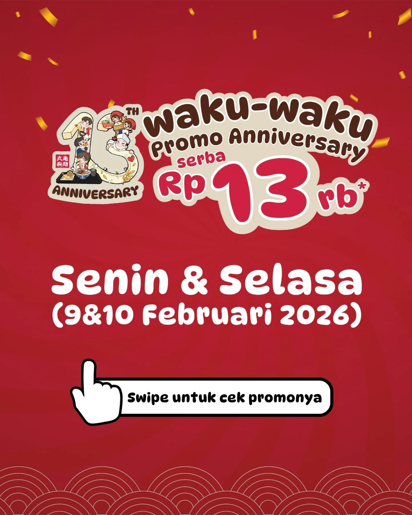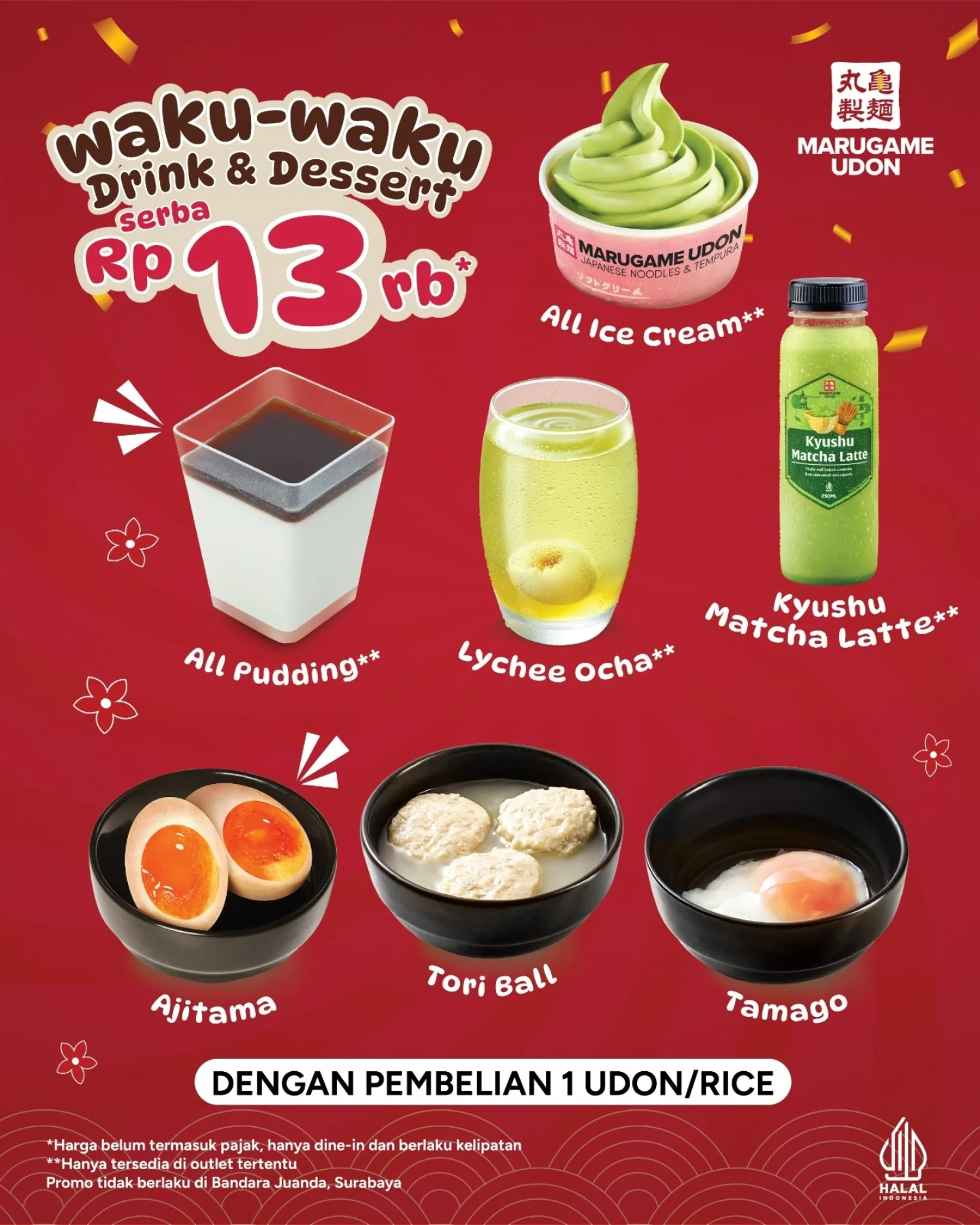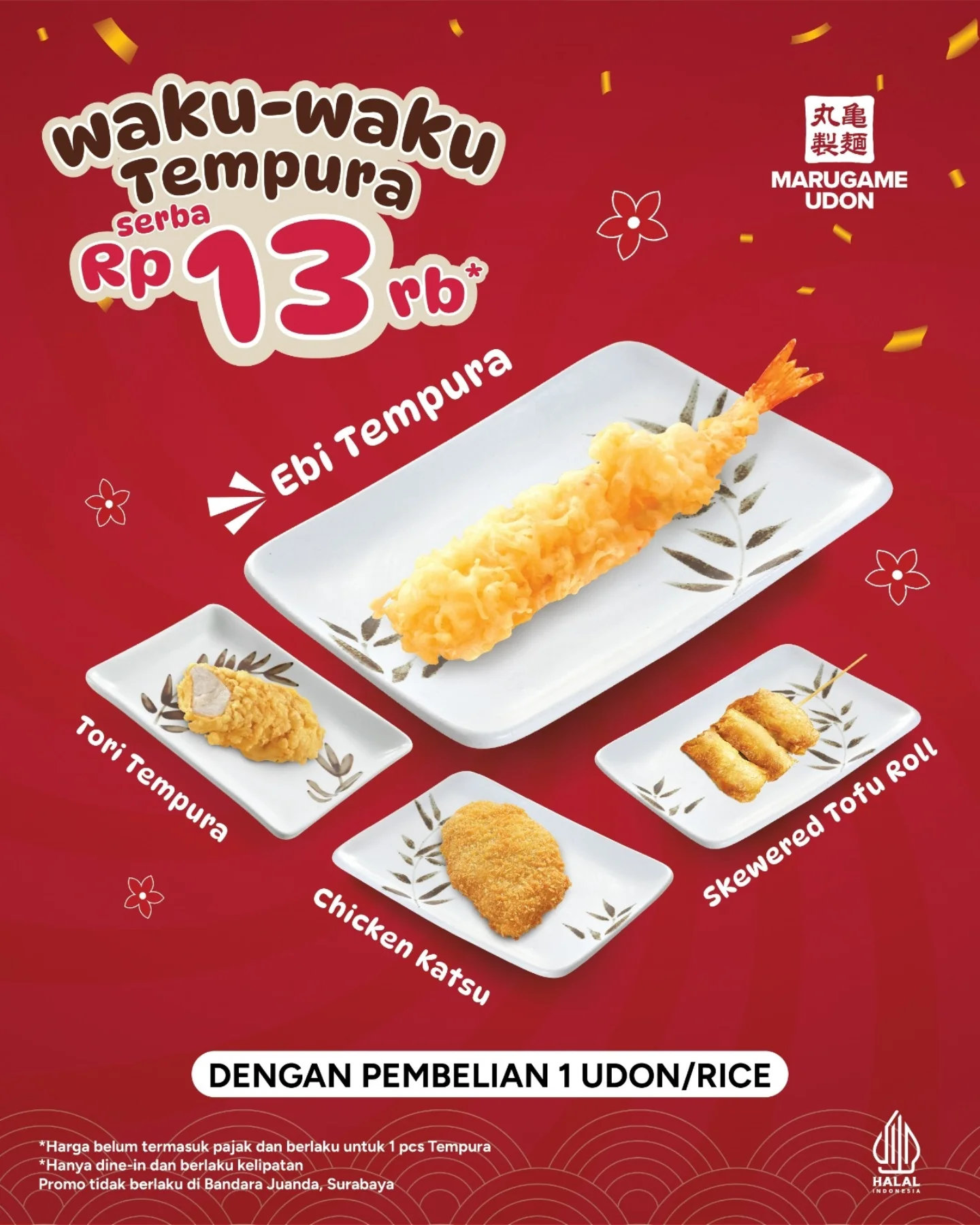 Marugame Udon menghadirkan program Anniversary dengan harga serba Rp13.000 untuk menu pilihan dalam rangka perayaan ulang tahun ke-13. Promo ini berlangsung selama periode 9-15 Februari 2026 dan berlaku di seluruh outlet Marugame Udon di Indonesia, kecuali outlet Bandara Juanda Surabaya.