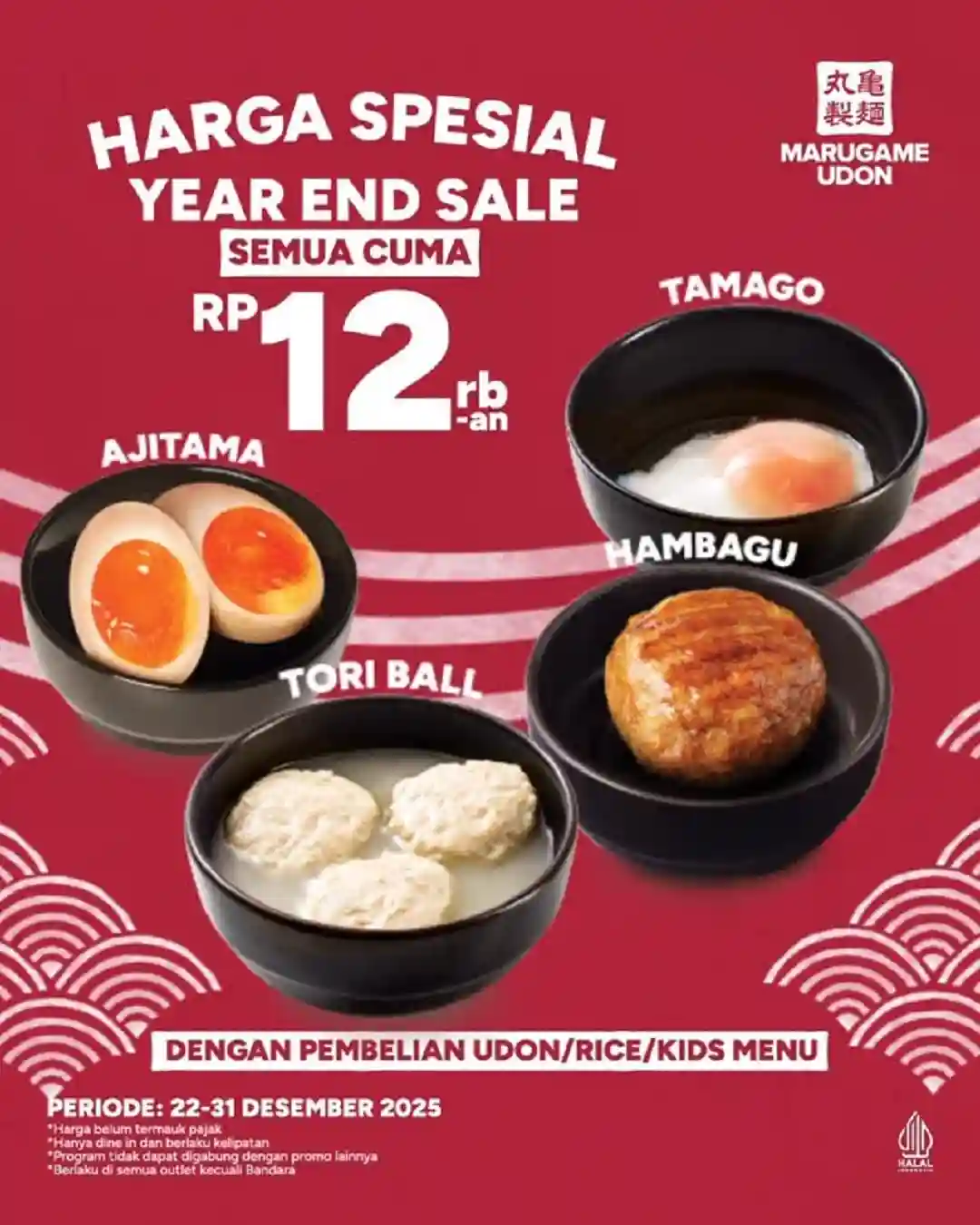 Promo Marugame Udon Spesial Akhir Tahun Hanya 12 Ribuan berlaku mulai 22 hingga 31 Desember 2025. Promo ini hanya bisa dinikmati untuk dine in di seluruh outlet Marugame Udon, kecuali outlet bandara. Selain itu, promo tidak dapat digabungkan dengan promo lainnya.