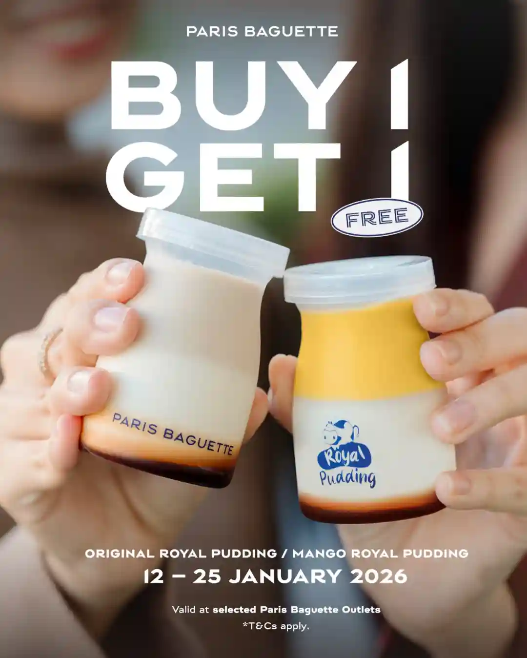 Paris Baguette menghadirkan promo Buy 1 Get 1 untuk menu Royal Pudding dengan pilihan rasa Original atau Mango. Promo ini menjadi kesempatan bagi pencinta dessert untuk menikmati dua porsi pudding dengan satu kali pembelian.