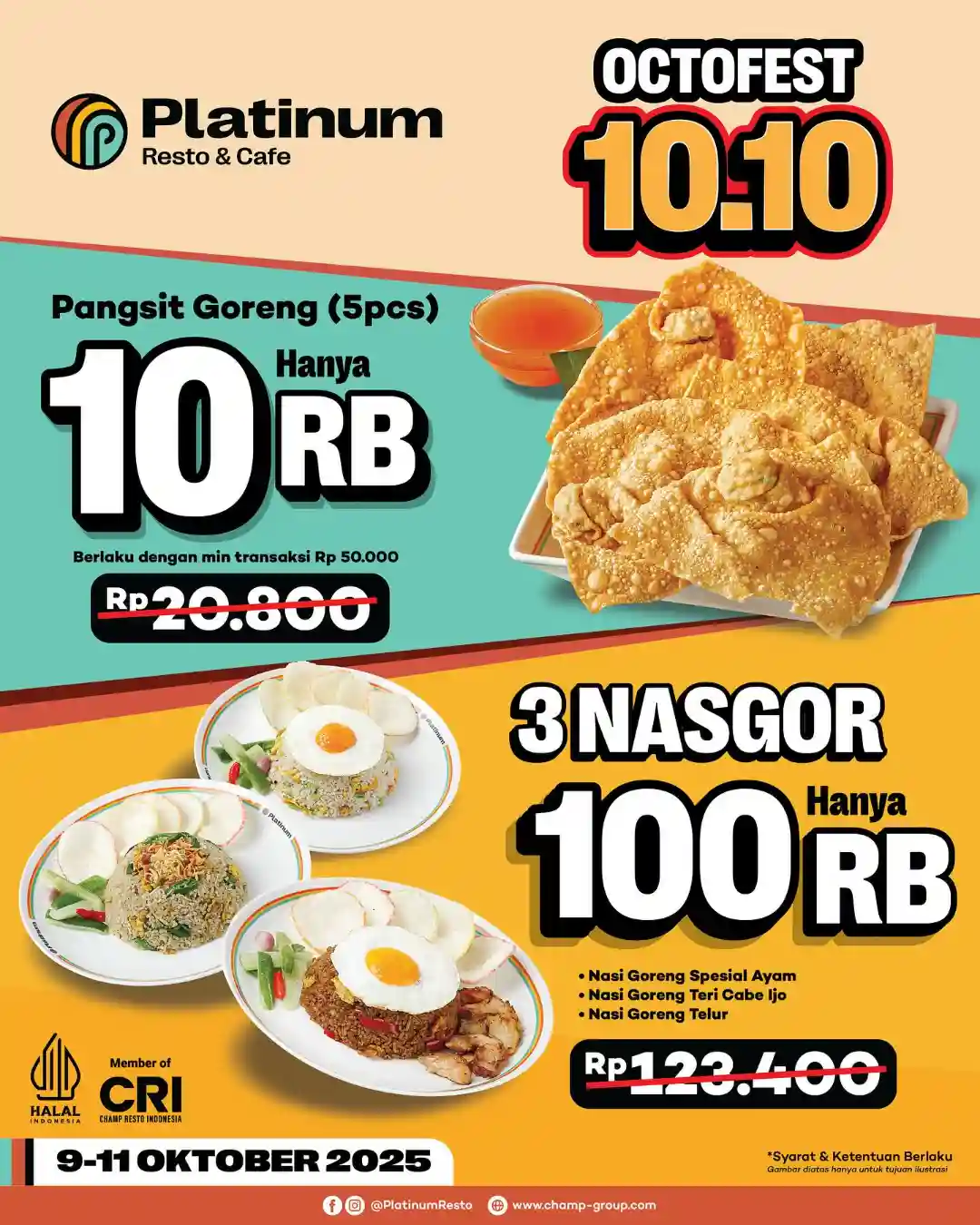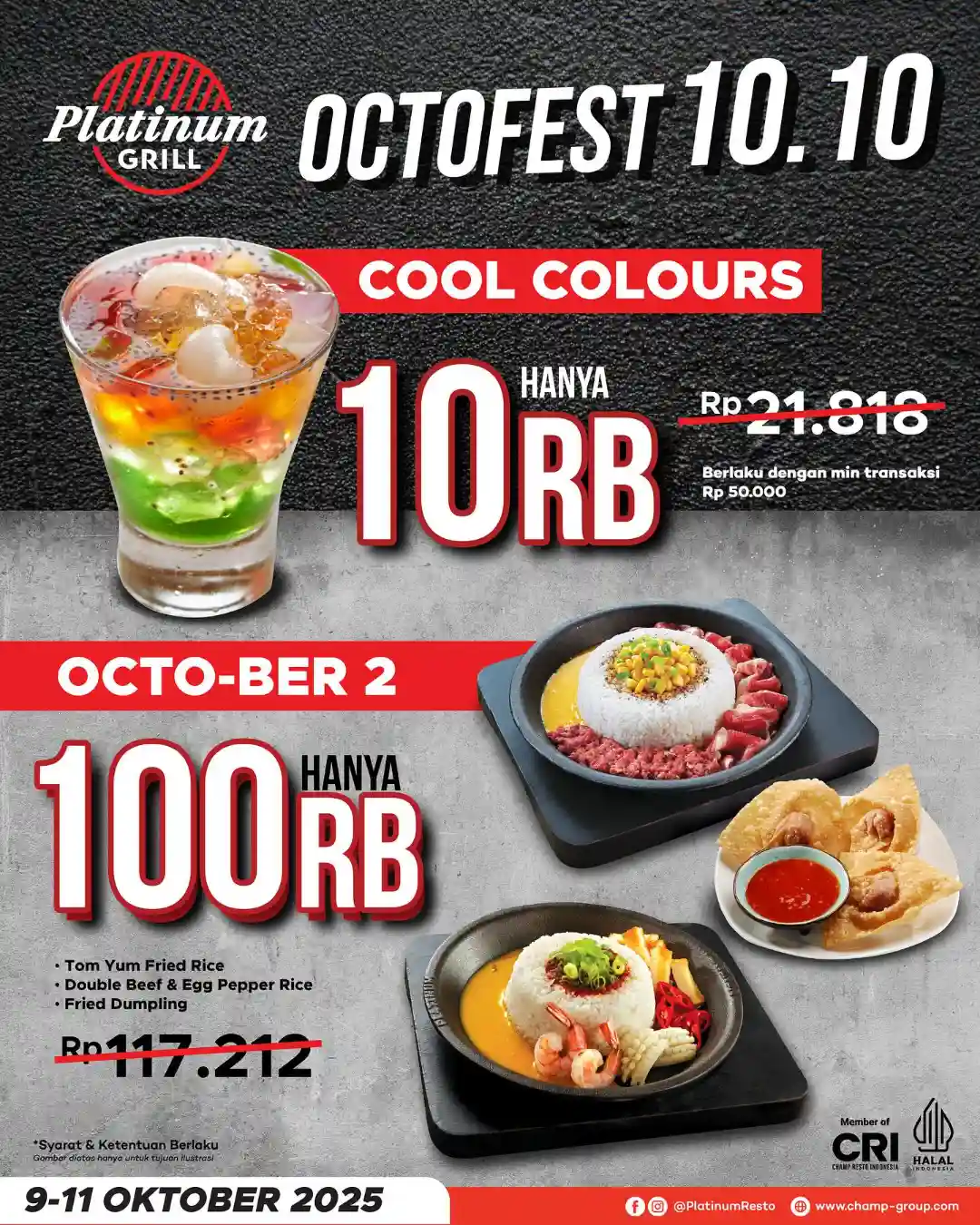 Dalam rangka memeriahkan momen Oktober penuh promo, Platinum Resto & Cafe menghadirkan program OCTOFEST 10.10 yang berlangsung mulai 9 hingga 11 Oktober 2025. Selama periode ini, pelanggan bisa menikmati dua penawaran utama yang sangat menarik:
