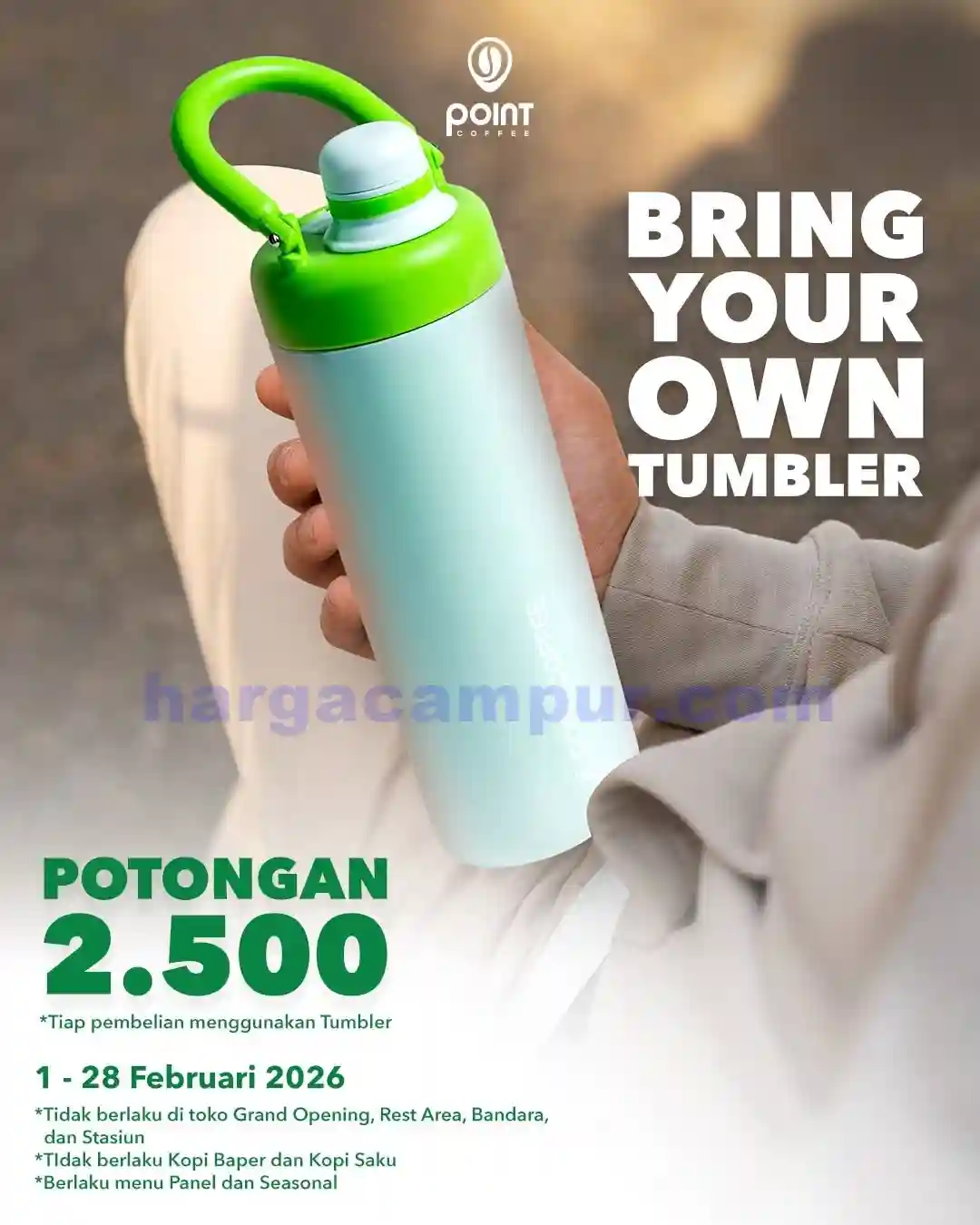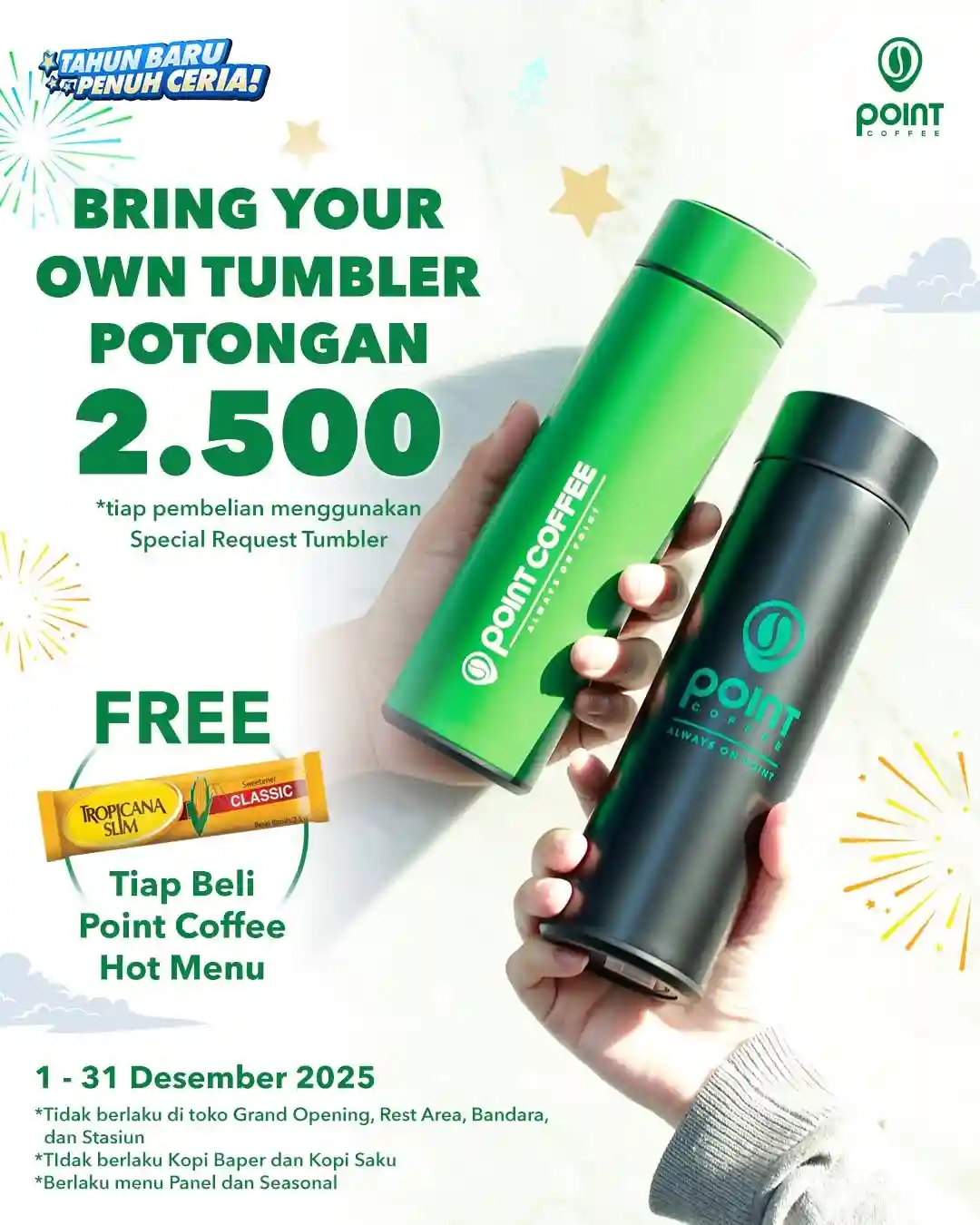 Selain promo menarik, Point Coffee juga punya program ramah lingkungan bertajuk Bring Your Own Tumbler. Dengan membawa tumbler pribadi saat membeli minuman, pelanggan bisa mendapatkan tambahan diskon sebesar Rp2.500.