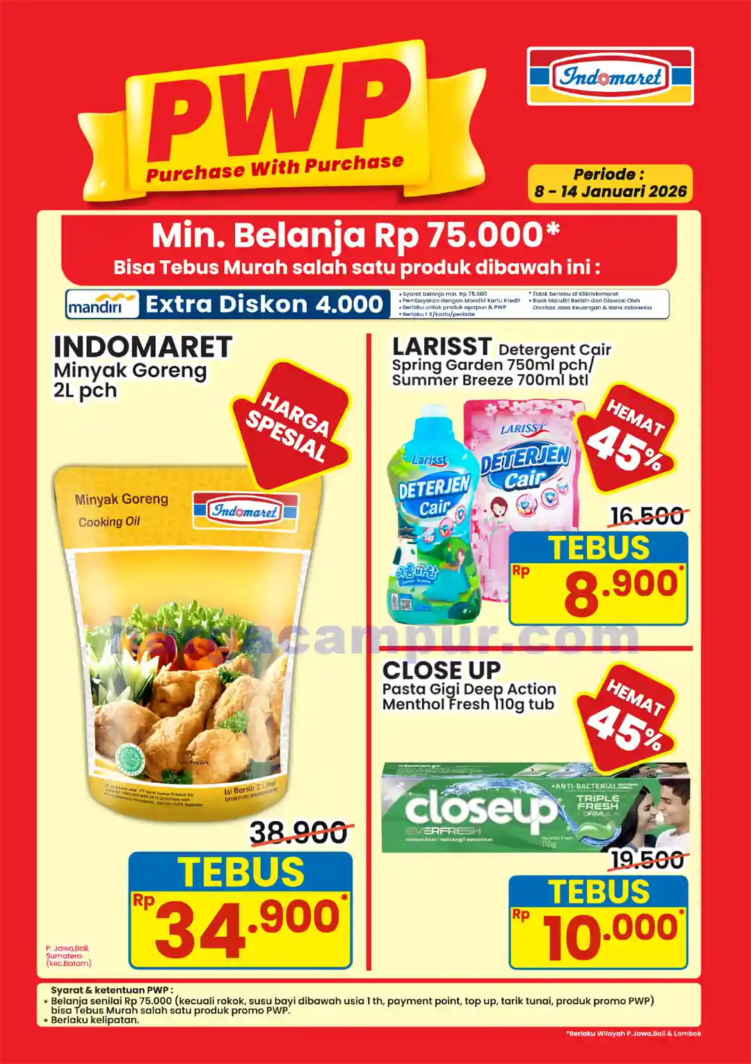 Indomaret kembali menghadirkan promo spesial di bulan Januari 2026 lewat program PWP (Purchase With Purchase). Program ini selalu jadi incaran banyak pelanggan setia karena memungkinkan pembeli untuk menebus produk tertentu dengan harga super hemat setelah mencapai nominal belanja minimum. Untuk periode 8 – 14 Januari 2026, kamu bisa mendapatkan produk kebutuhan rumah tangga seperti Fortune Minyak Goreng, Total Detergent, dan Kecap Bango dengan harga tebus mulai dari Rp8.900 saja.