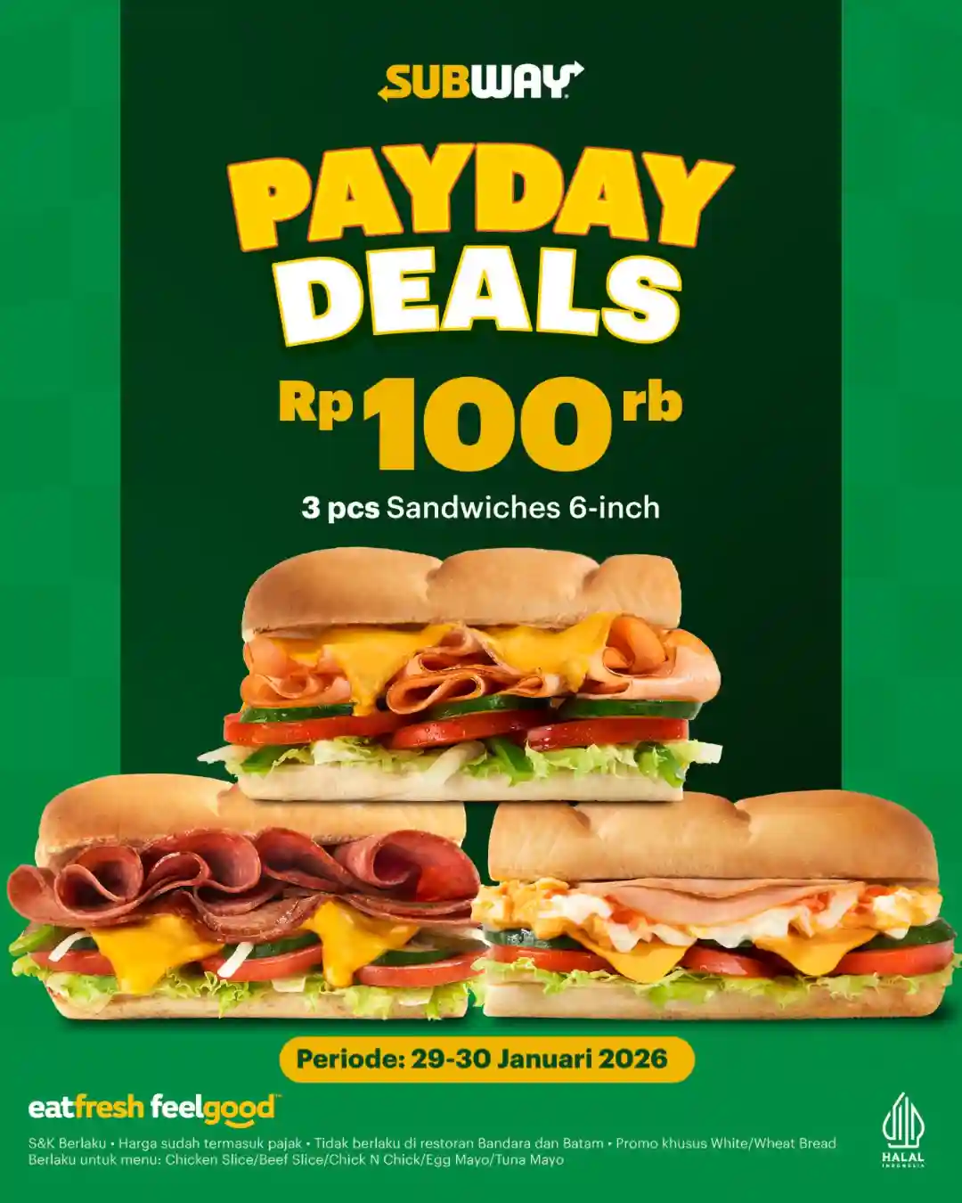 Momen akhir bulan identik dengan payday, dan Subway menghadirkan penawaran hemat lewat Promo Subway Payday Deals. Dalam promo ini, pelanggan bisa mendapatkan 3 sandwich ukuran 6-inch hanya Rp100.000. Harga tersebut sudah termasuk pajak, sehingga makin praktis tanpa hitung-hitungan tambahan.