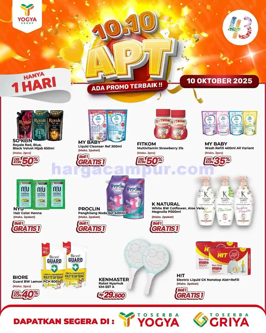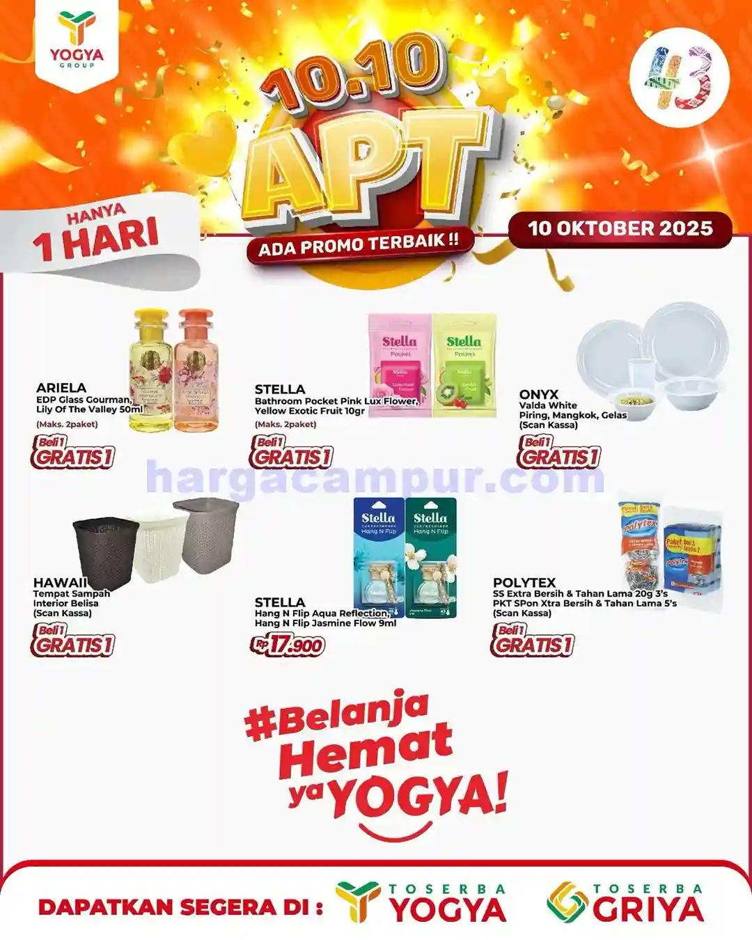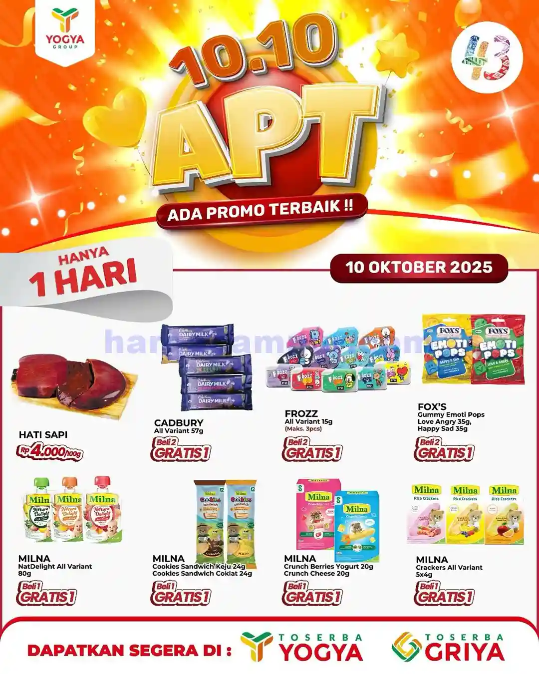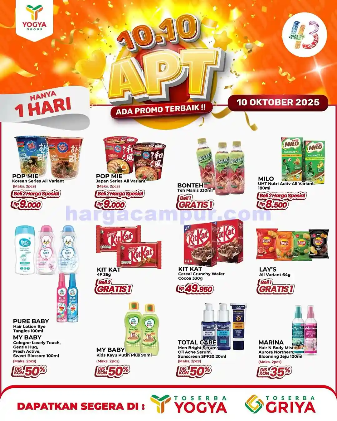 Promo Toserba Yogya Spesial APT 10.10 Terbaru 10 Oktober 2025 ini bukan sekadar momen belanja biasa, tapi kesempatan emas untuk berhemat besar-besaran dalam sehari. Mulai dari makanan, minuman, produk bayi, hingga kebutuhan rumah tangga semuanya bisa kamu dapatkan dengan harga jauh lebih hemat dari biasanya.