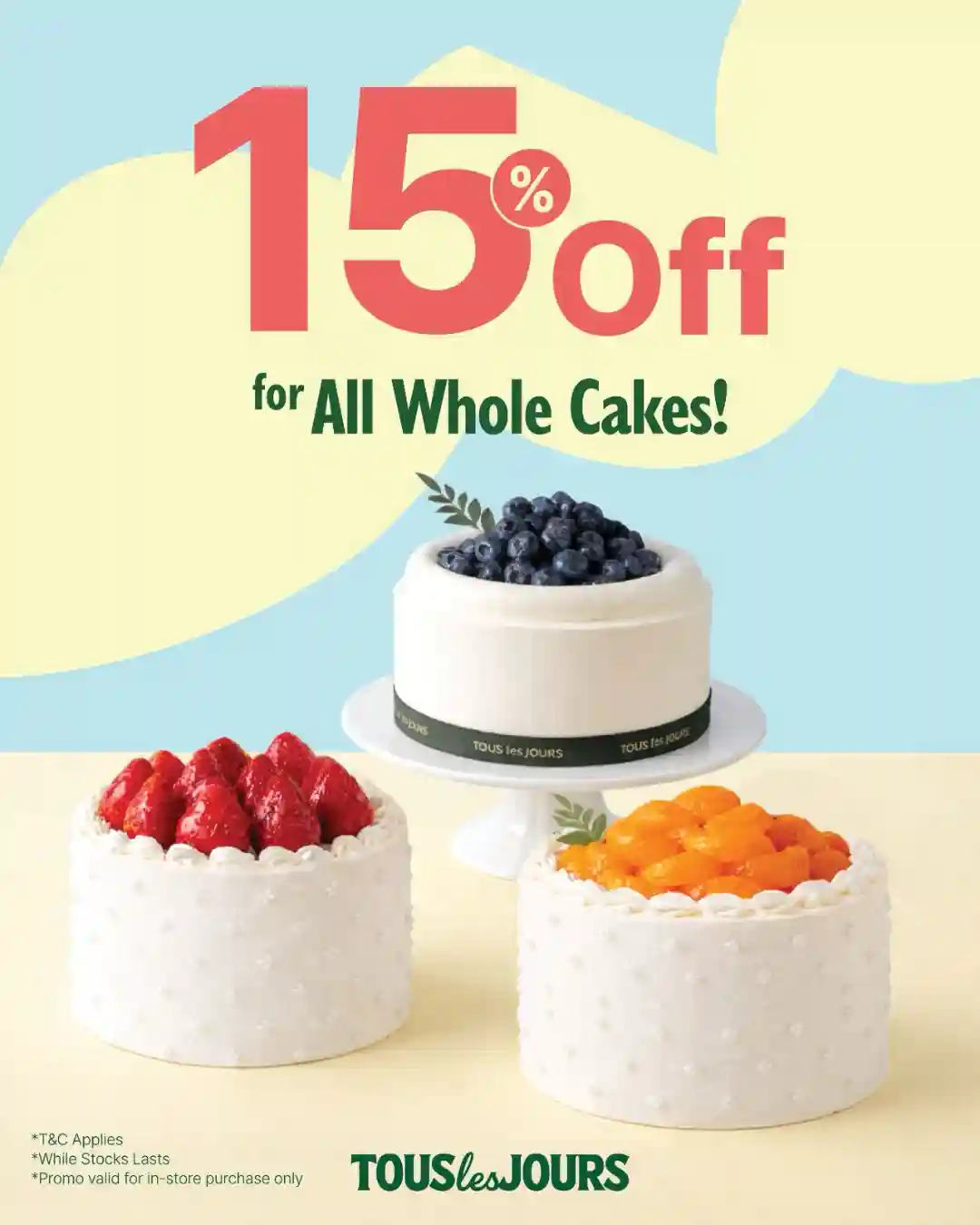 - Diskon hingga 15% berlaku untuk pembelian Whole Cake.