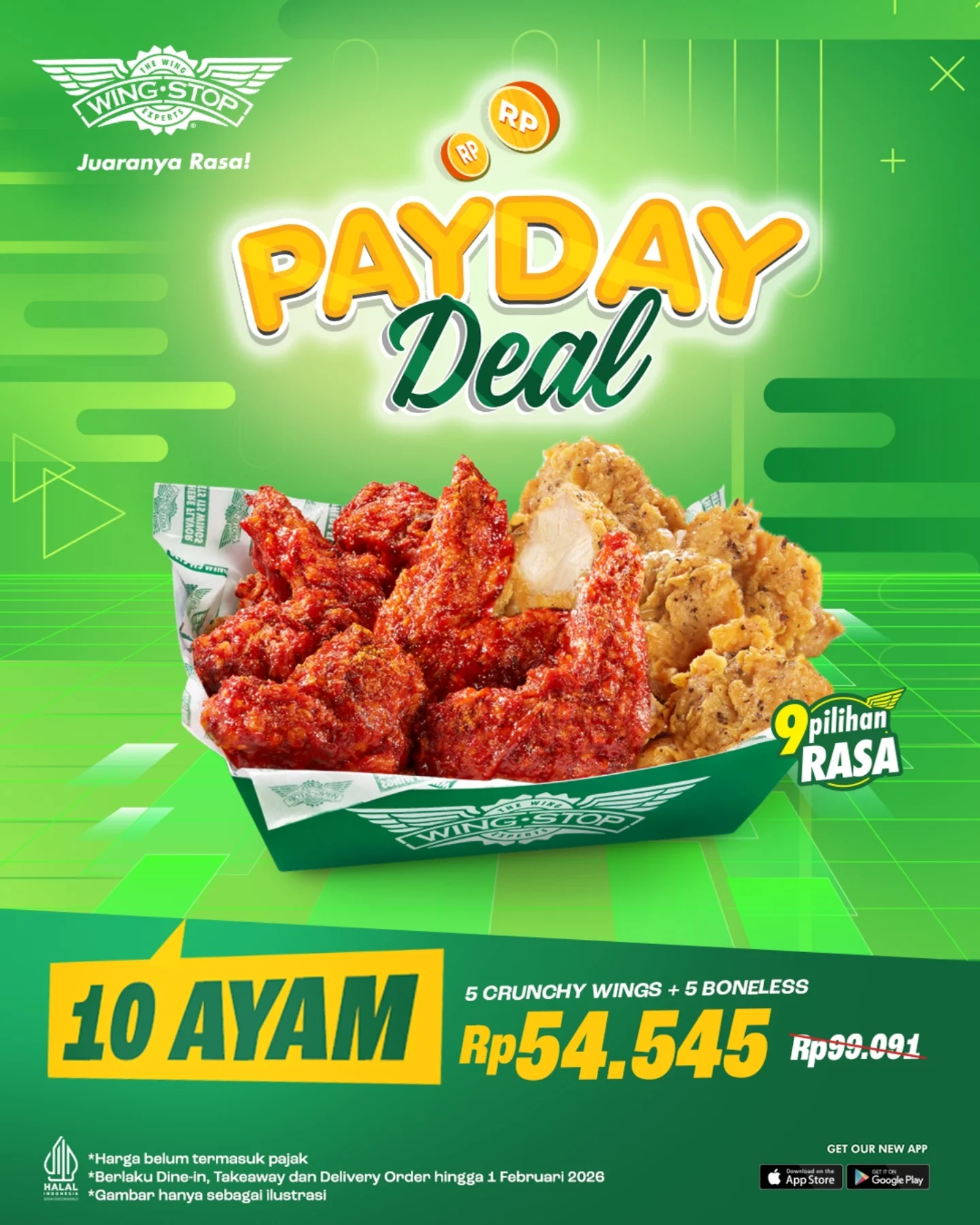 Promo Wingstop Payday Deal 10 Ayam Rp 54.545 berlaku di outlet Wingstop yang berpartisipasi selama periode promo masih berlangsung.