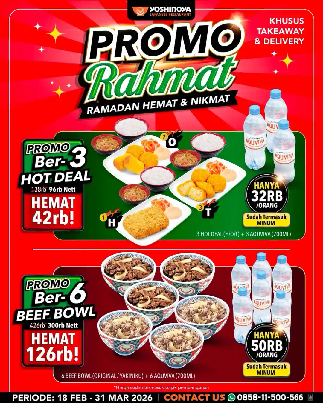 Promo Yoshinoya Rahmat Bukber berlaku mulai 18 Februari 2026 hingga 31 Maret 2026 selama bulan Ramadan. Seluruh paket ditujukan untuk kebutuhan buka puasa bersama dengan sistem pemesanan yang praktis tanpa perlu makan di tempat.